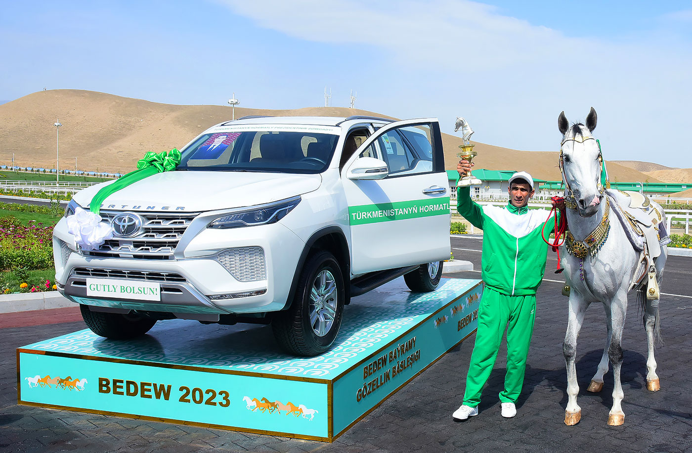 Затем состоялась церемония вручения от имени Президента Сердара Бердымухамедова главного приза победителю праздничных состязаний наездников-наставников военных и правоохранительных структур. Лучший результат показал наездник Е.Назармырадов на гнедом коне Комек из конюшни Министерства внутренних дел, потомок скакунов Кеймиркёр и Айгуль. Ему были вручены ключи от автомобиля марки «Toyota Camry».