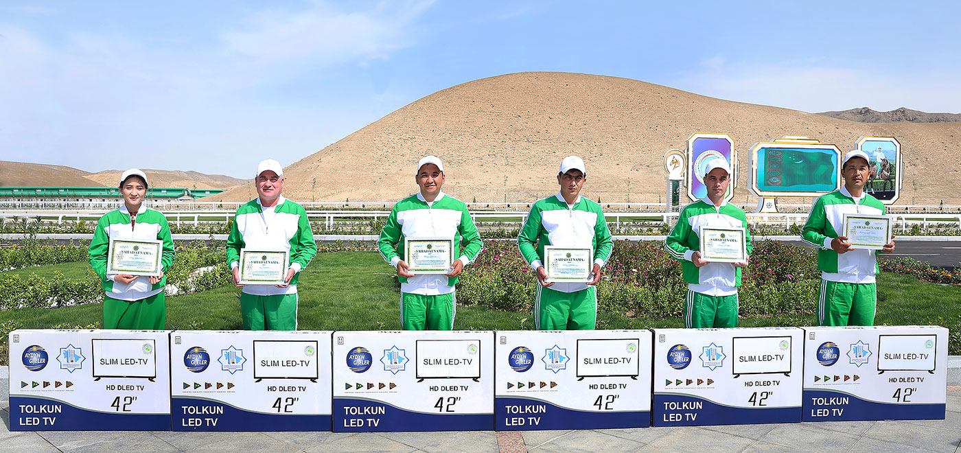 Главные призы от имени Президента Сердара Бердымухамедова – телевизоры «Tolkun» и соответствующие дипломы были вручены следующим победителям: народному художнику Туркменистана Ада Гутлыеву – за ковровое полотно «Беркарар и Багтыяр»; преподавателю кафедры декоративно-прикладного искусства Государственной академии художеств Туркменистана Ширин Гылыджовой – за ансамбль конских украшений; преподавателю кафедры декоративно-прикладного искусства ГАХТ Закирджану Бабаеву – за картину «Туркменский скакун, принёсший славу»; студенту Государственной академии художеств Туркменистана Кериму Солтанову – за скульптурную композицию «Райские кони»; оператору компьютера цеха допечатных процессов Центра печати Туркменской государственной издательской службы Мердану Кыясову – за фотоработы под названием «Туркменские кони»; телеоператору канала «Türkmen owazy» Государственного комитета Туркменистана по телевидению, радиовещанию и кинематографии Мухамметгелди Гулову – за видеоролик «Скакуны».