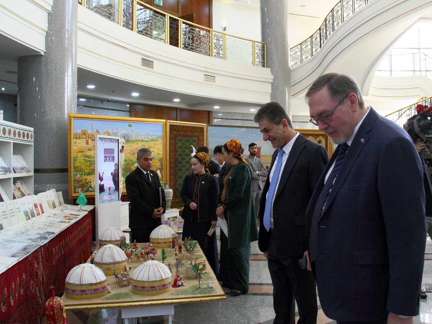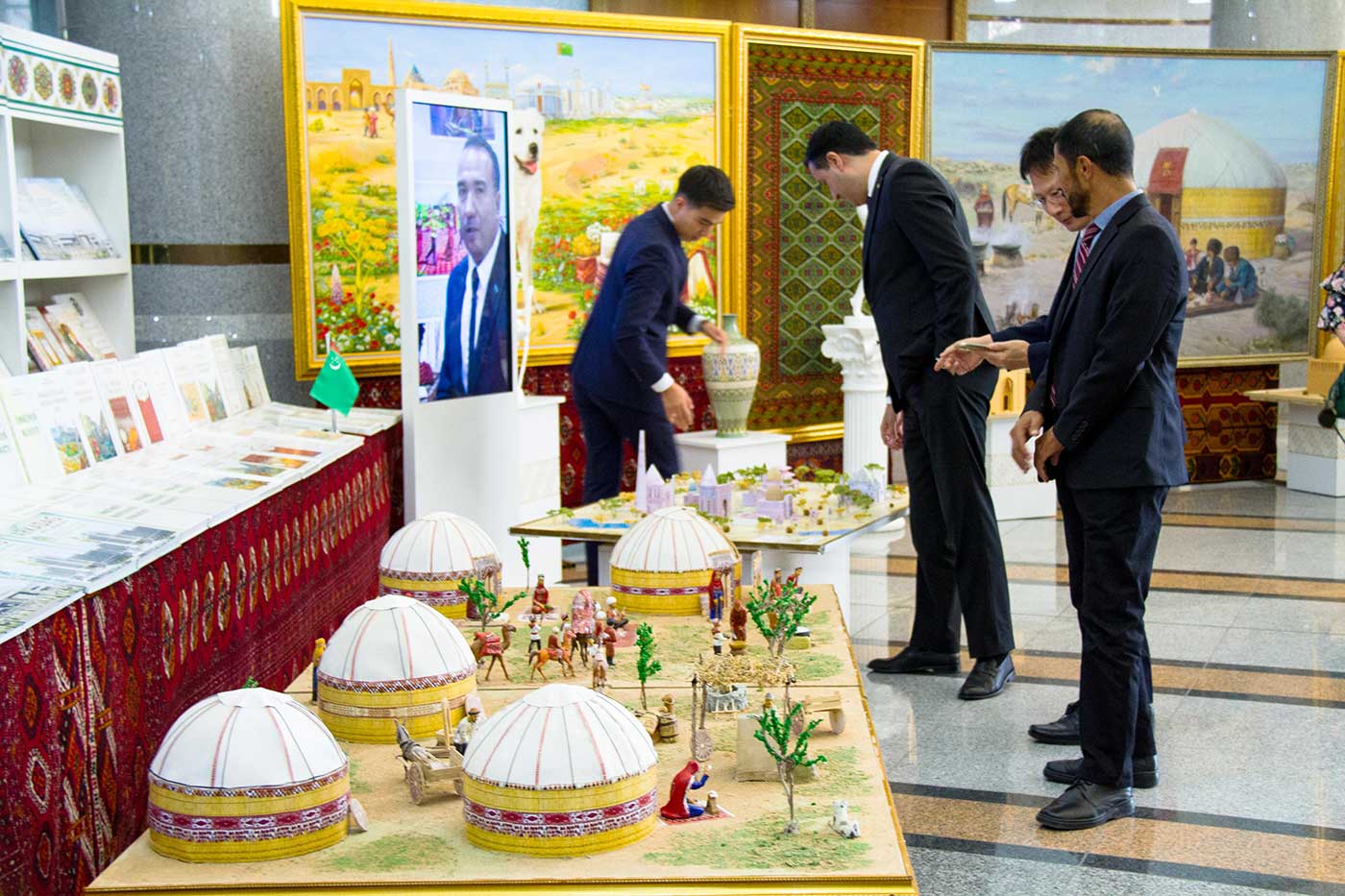 По случаю знаменательной даты в фойе вуза была развёрнута выставка, экспозицию которой составили образцы изобразительного и декоративно-прикладного искусства, традиционных народных ремёсел, знаменитые туркменские ковры, национальная одежда и украшения, музыкальные инструменты. Являясь материальными свидетельствами самобытного культурного наследия, они заключают в себе красоту и глубину души народа, пронесённые сквозь века и бережно сохранённые богатые духовные традиции.