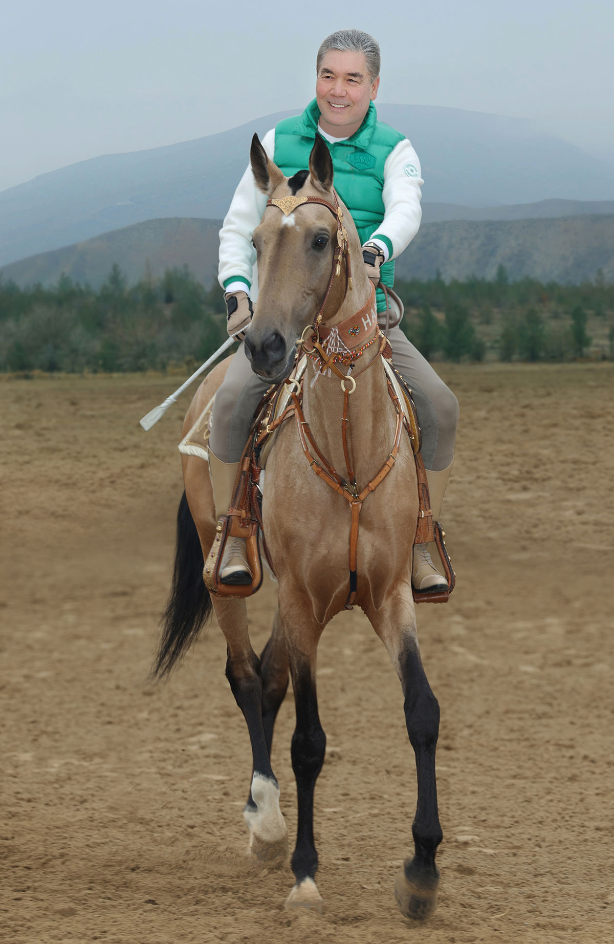 Во время конной прогулки Герой-Аркадаг пустил скакуна рысью. Будучи в руках опытного наездника, конь высоко поднял голову и продолжил свой бег.