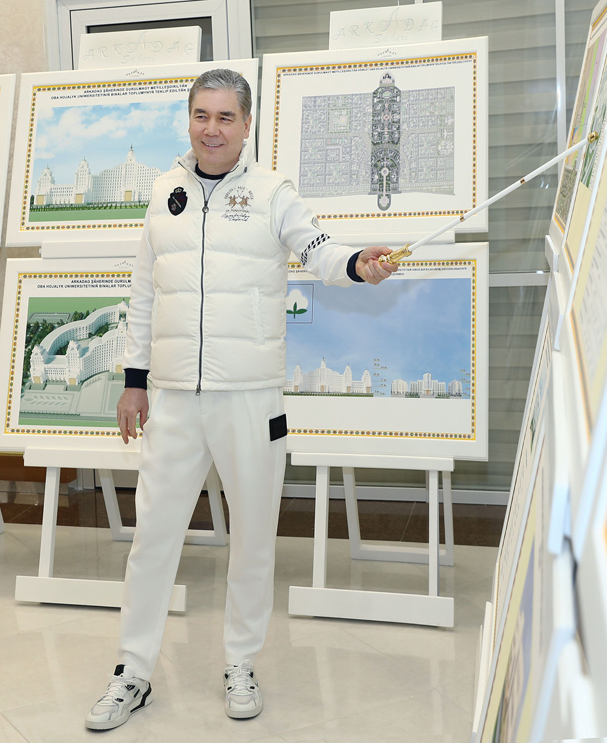 Затем Национальный Лидер туркменского народа ознакомился с представленными проектами, в числе которых чертежи комплекса зданий Сельскохозяйственного университета, промышленных объектов, музея, Дома здоровья, Службы пожарной охраны, а также парка «Saglyk». Также здесь были продемонстрированы проекты внутреннего убранства Главной мечети города Аркадаг, виды символов, относящихся к медицинским учреждениям.