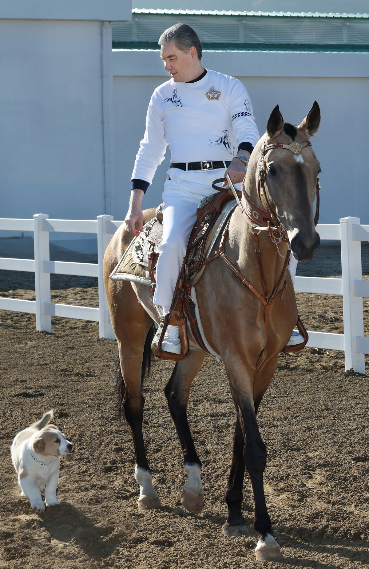 Национальный Лидер туркменского народа вместе с щенком алабая направился к манежу конного комплекса. Здесь особый ценитель ахалтекинских скакунов Герой-Аркадаг оседлал своего коня по кличке Ханбег и прокатился по манежу. Щенок Шатлык, не отставая, следовал за конём.