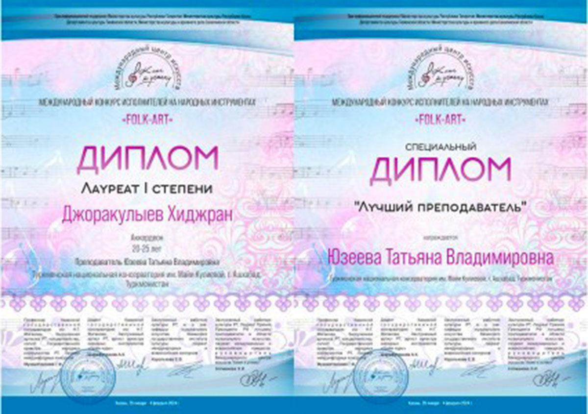 На завершившемся недавно в Казани Международном конкурсе исполнителей на народных инструментах «FOLK-ART» студент третьего курса факультета «Народная музыка» Туркменской национальной консерватории имени Маи Кулиевой Хиджран Джоракулиев занял первое место среди 20-25-летних музыкантов по игре на музыкальном инструменте «Аккордеон» и был награжден дипломом.