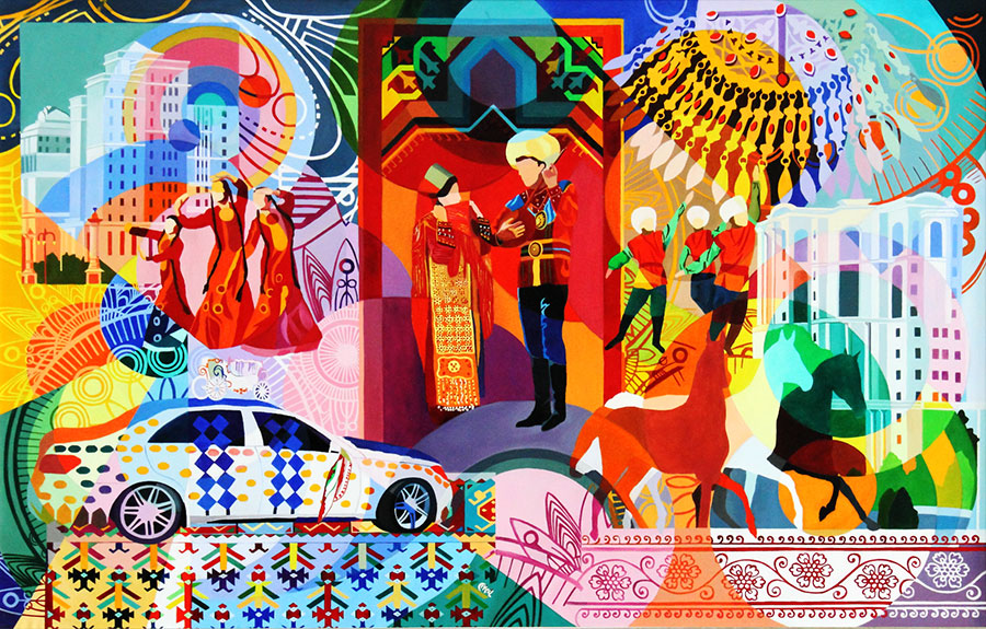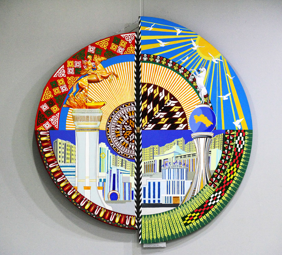 Хорошо вписалась в общее настроение, исходящее от выставляемых работ, картина Сульгун Гурбандурдыевой «Город Аркадаг – мирный город». Сульгун выполнила ее в плакатном стиле в форме круга. Необычная композиция, декоративность современной архитектуры и памятник Огуз хану создают философский подтекст в интерпретации этой картины, где запечатлена встреча исторического прошлого с настоящим.