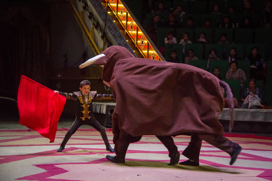 В этот раз на высоте оказалась клоунада. С новым номером выступил Пена Муратдурдыев в роли тореадора, который красной тряпкой отважился дразнить свирепого быка. В какой-то миг мужество оставило его, и со страха он оказался на коленях у зрительницы. Но Пена смог взять вверх над самообладанием, оседлал быка и победителем покинул сцену. Зрители смеялись до слез.