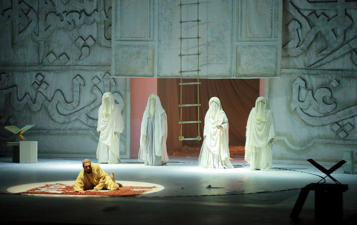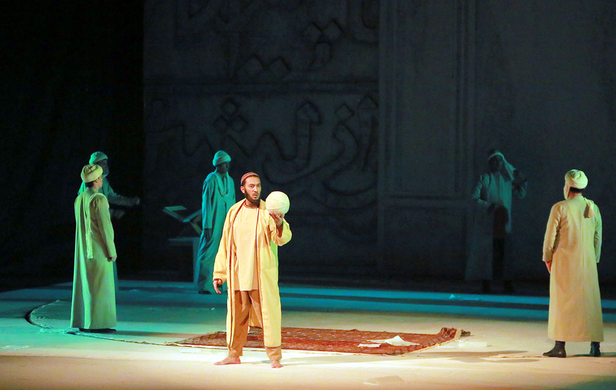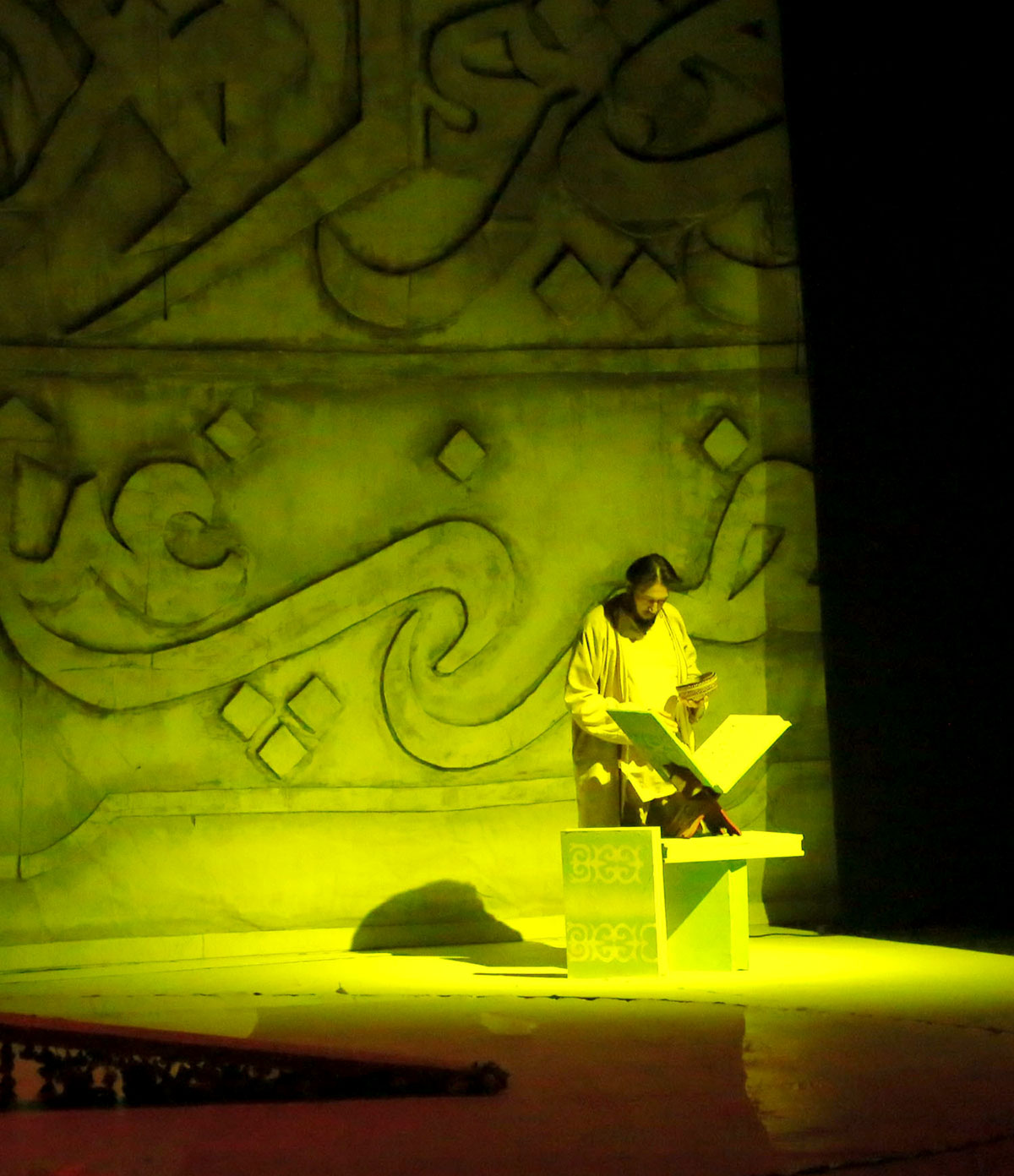 – Мы хотели донести до зрителя познание поэта самого себя, - делится Мекан Джумабаев, - и использовали при этом мистику, метафору, символизм. Текст пьесы написан стихами Махтумкули, каждая деталь в сценографии символизирует тот или иной нюанс характеристики поэта. Черно-белый цвет занавесей – ночь и день, кстати, к концу спектакля белого цвета в занавесях становится больше, что означает ожидание светлого будущего. Задний план сцены состоит из рукописей стихов Махтумкули. Сам поэт выступает на сцене босым. Вряд ли Махтумкули, выходец из благополучной интеллигентной семьи, ходил при жизни без обуви, но в спектакле – это тоже метафора, подчеркивающая открытость помыслов его поэтических строк.