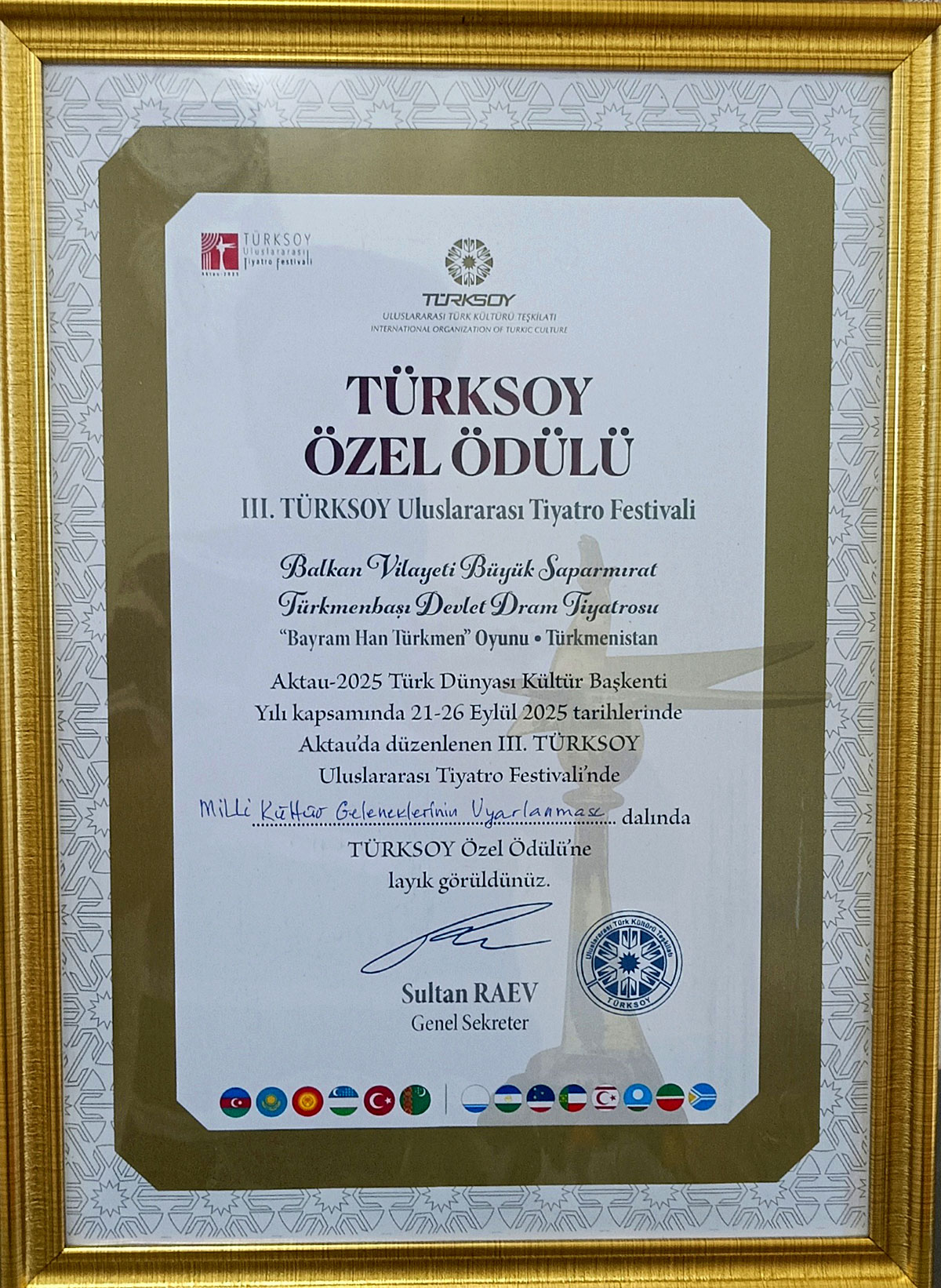 Государственный драматический театр имени Сапармурата Туркменбаши Балканского велаята был удостоен награды в номинации «За популяризацию национальных традиций» за спектакль «Baýram han türkmen». Эта награда стала значимым подарком к 34-летию независимости Туркменистана, которое отмечалось в эти дни, и займёт достойное место в музее театра.