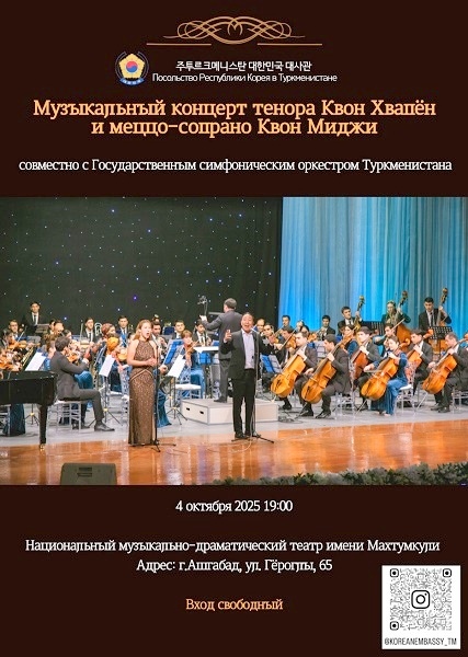 4 октября в 19:00 в Национальном музыкально-драматическом театре имени Махтумкули в сотрудничестве с Государственным симфоническим оркестром Туркменистана пройдёт концерт южнокорейских исполнителей – тенора Квон Хвапён и меццо-сопрано Квон Миджи. Вход свободный.