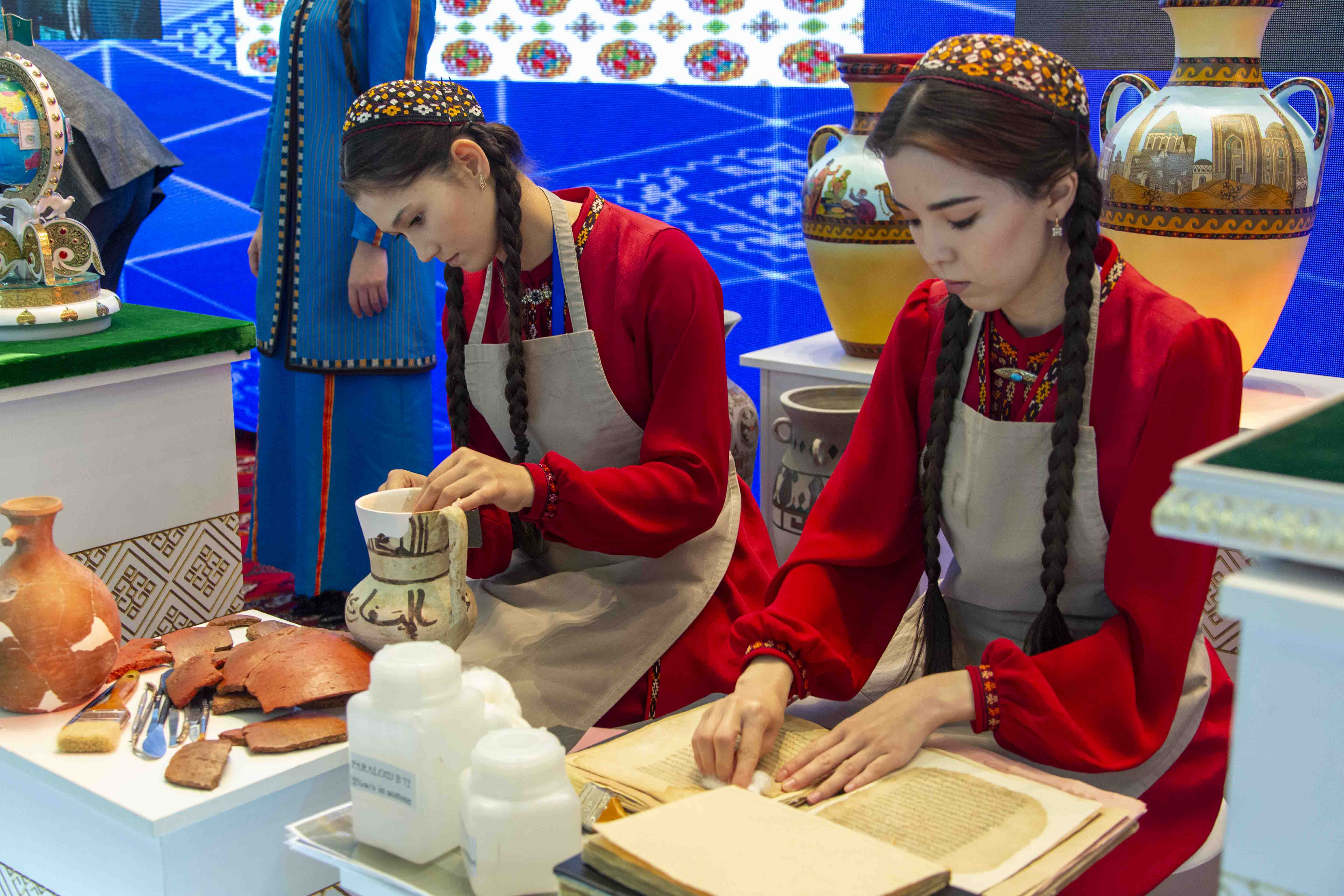 Кроме того, в экспозиции был представлен процесс реставрации талантливыми студентами института образцов гончарных изделий и древних рукописей, найденных в результате археологических раскопок.