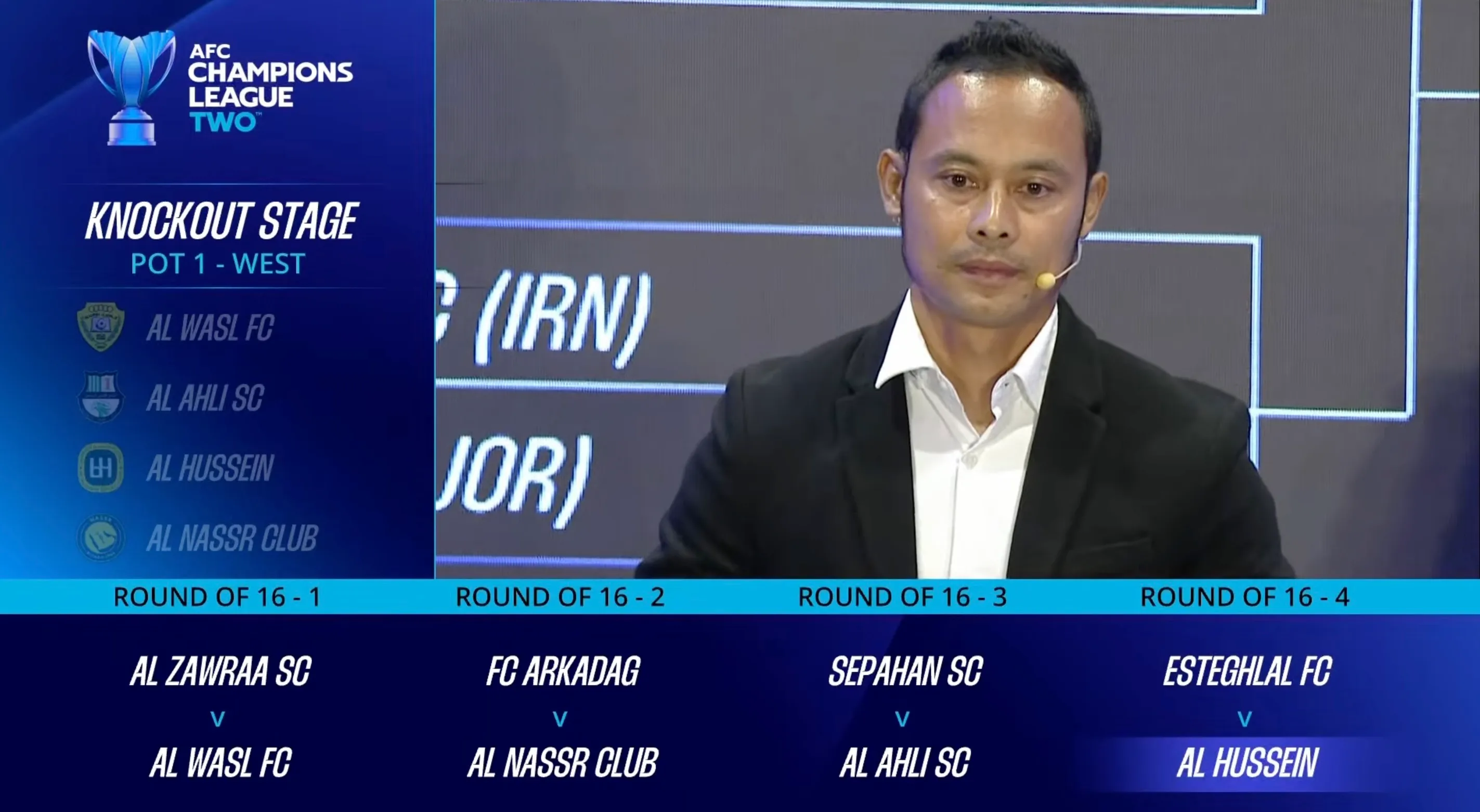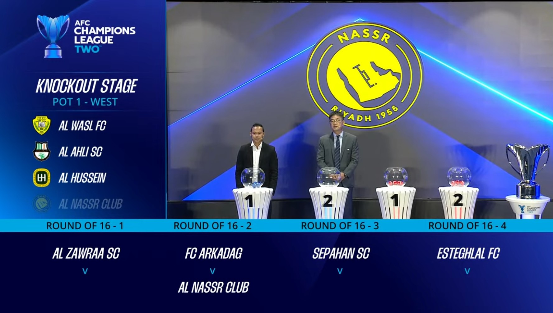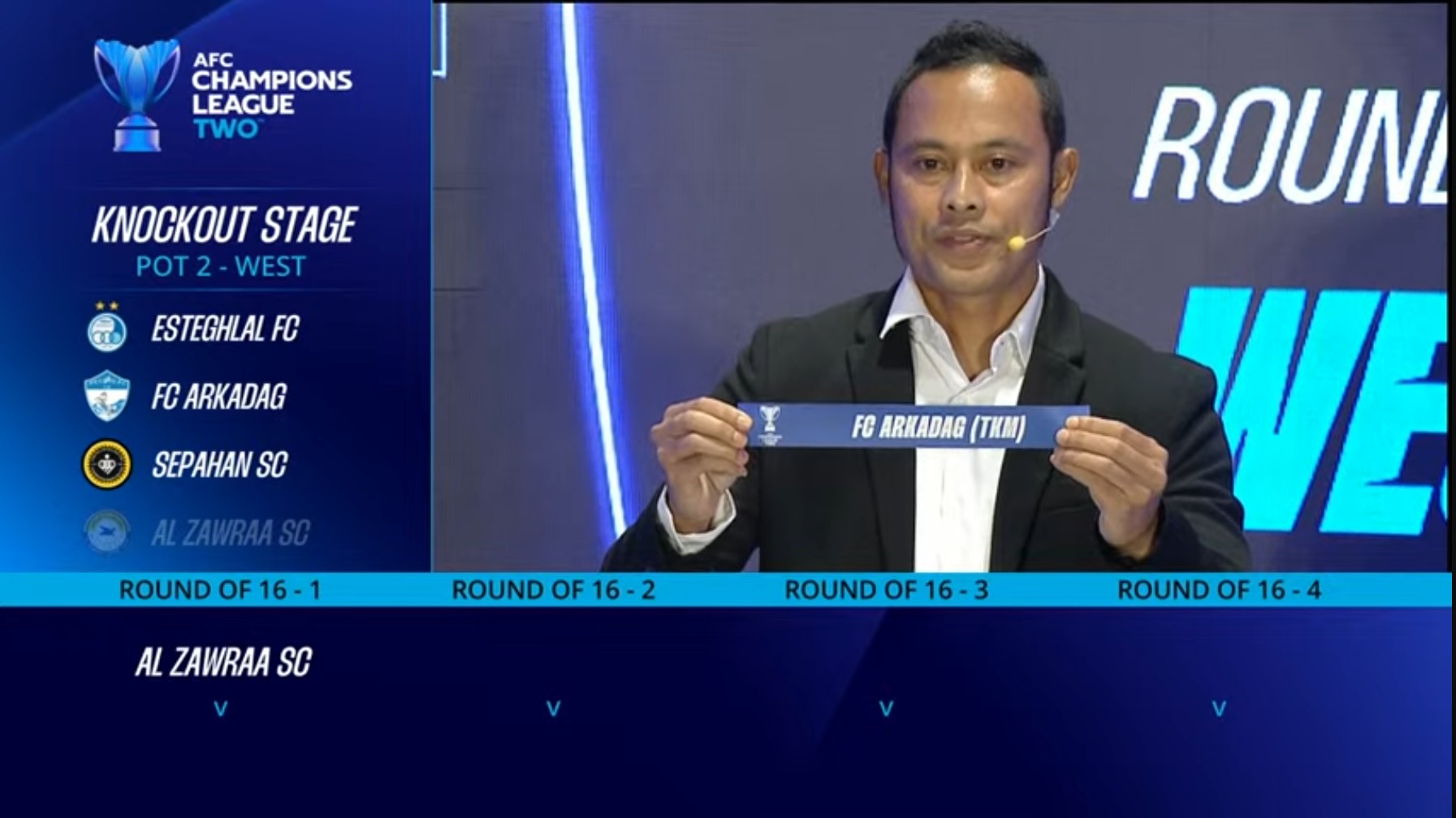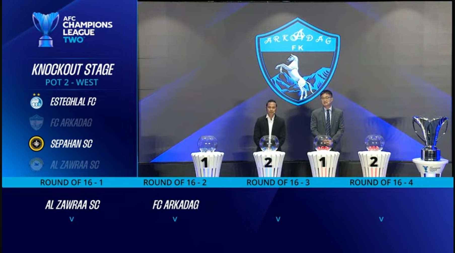 Bu toparlaryň arasyndaky iki oýunly duşuşygyň ýeňijisi çärýek finalda «Al-Zawraa» (Yrak) we «Al-Wasl» (BAE) toparlarynyň arasyndaky duşuşygyň ýeňijisi bilen oýnar. Günbatar zolagynyň beýleki çärýek finalynda bolsa «Foolad Mobarek Sepahan» (Eýran) we «Al-Ahli» (Katar) hem-de «Esteglal» (Eýran) we «Al-Hussein» (Iordaniýa) toparlarynyň ýeňijileri bäsleşer.