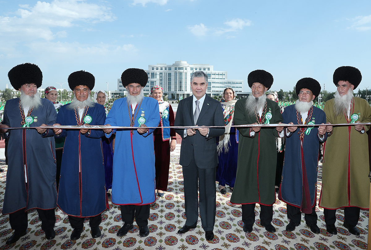 Soňra hormatly Prezidentimiz Gurbanguly Berdimuhamedow ýygnananlaryň şowhunly el çarpyşmalary astynda hormatly ýaşulular bilen “Türkmeniň ak öýüniň” binasynyň toý bagyny kesýär.