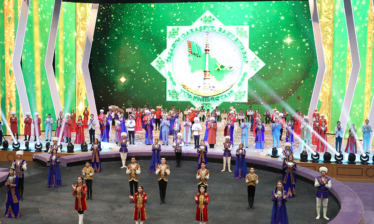 Belli aýdymçylar we sazandalar öz çykyşlarynda eziz Diýarymyzy hem-de milli Liderimizi, täze taryhy eýýamyň belent döredijilik ruhuny, hormatly Prezidentimiz Gurbanguly Berdimuhamedowyň baştutanlygynda ýetilen belent sepgitleri, halkymyzyň mizemez jebisliginiň hem-de ösüşiň ýolunda amala aşyrylýan belent özgertmeleri wasp etdiler.