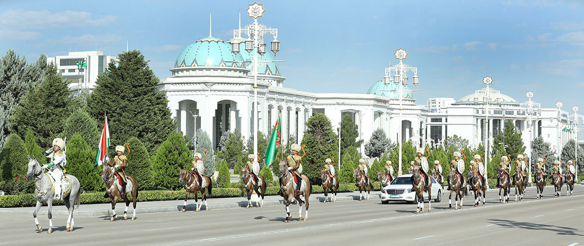 Resmi garşylamak dabarasy tamamlanandan soňra Hormat garawulynyň esgerleri Garaşsyzlyk meýdany boýunça dabaraly ýörişi geçýärler.