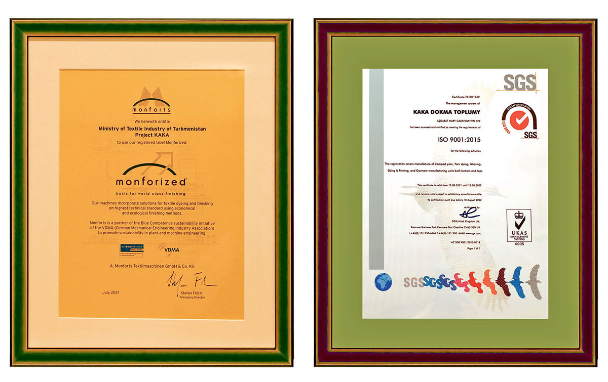Häzirki wagta çenli Türkmenistanyň dokma toplumy we Türkmenistanyň dokma senagaty ministrligine degişli pagta egriji fabrikleri halkara derejede ykrar edildi we olara ISO 9001, ISO 14001 we OHSAS 18001 güwänamalary gowşuryldy.