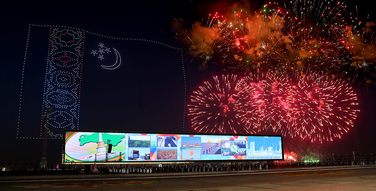 Aýdym-sazlar, joşgunly tanslar ýörite döwrebap enjamlar hem-de sanly tehnologiýalar arkaly döredilýän täsin şekiller we ajaýyp görnüşler bilen sazlaşykly utgaşdy. Paýtagtymyzyň arassa asmanynda Garaşsyz, baky Bitarap ýurdumyzyň milli gymmatlyklarynyň, döwlet nyşanlarynyň şekilleri peýda bolýar.