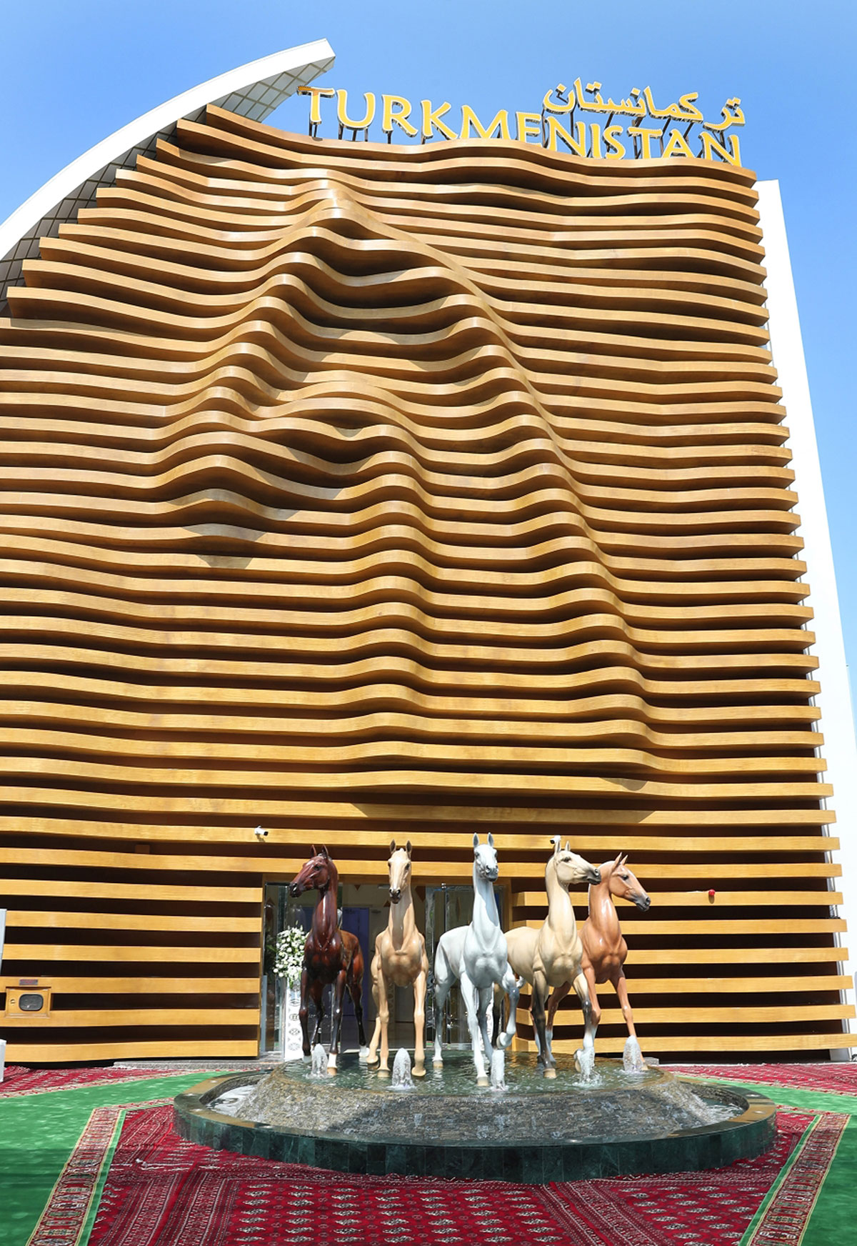 “Ykjamlyk” atly mowzuklaýyn zolakda ýerleşdirilen Türkmenistanyň bölüminiň binagärlik keşbi okgunly ösüşiň girewi hökmünde hemişelik hereket pikirini beýan edýär. Türkmen sergisiniň girelgesiniň ýanynda heýkel — çüwdürim ýerleşdirildi. Bu ýerde myhmanlary ady äleme dolan türkmenleriň milli baýlygy, buýsanjy hasaplanýan ahalteke bedewleri garşylaýar. Behişdi bedewleriň bäşisi ýurdumyzyň ösüşiň belentliklerine tarap gadamyny, milli mirasa sarpany, maksatlaryň bitewüligini, halkymyzyň jebisligini alamatlandyrýar. Ahalteke bedewiniň heýkeli binanyň ýelken şekilli zolagynda ýerleşdirilip, onuň ýüzündäki tolkun görnüşli gum aňňatlaryny alamatlandyrýar.