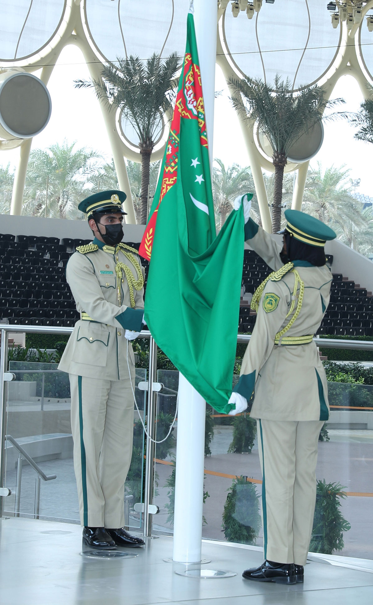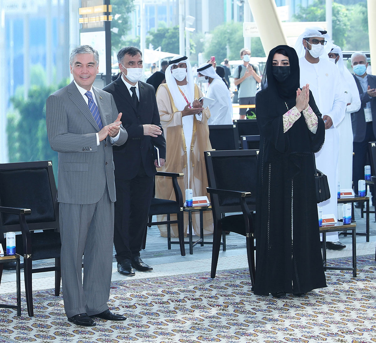 Merkeziň eýwanynda iki ýurduň Döwlet baýdaklarynyň öňünde bilelikde surata düşmek dabarasyndan soň, hormatly Prezidentimiz Türkmenistanyň milli gününiň açylyş dabarasynyň geçirilýän ýerine — “Al Wasl” dabaralar merkezine çagyryldy. Bu ýerde “EKSPO — 2020” sergisiniň guramaçylyk komitetiniň wekilleri, baýramçylyga gatnaşýan beýleki hormatly myhmanlar ýygnandylar.
