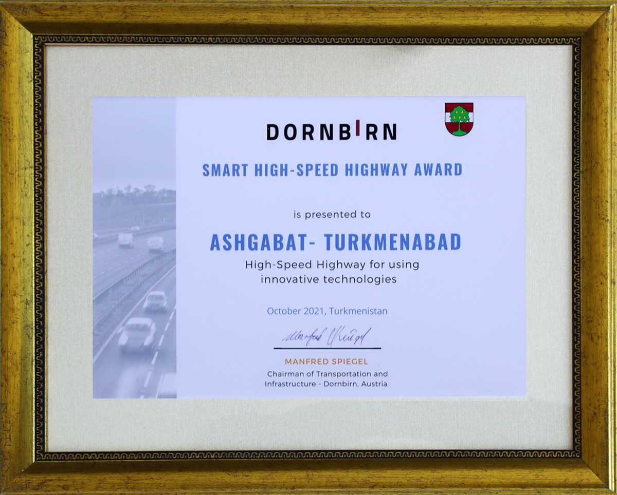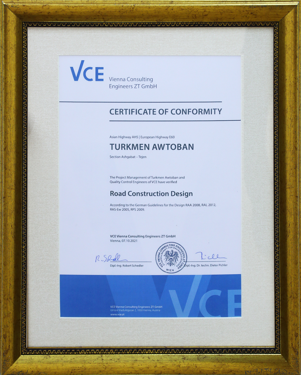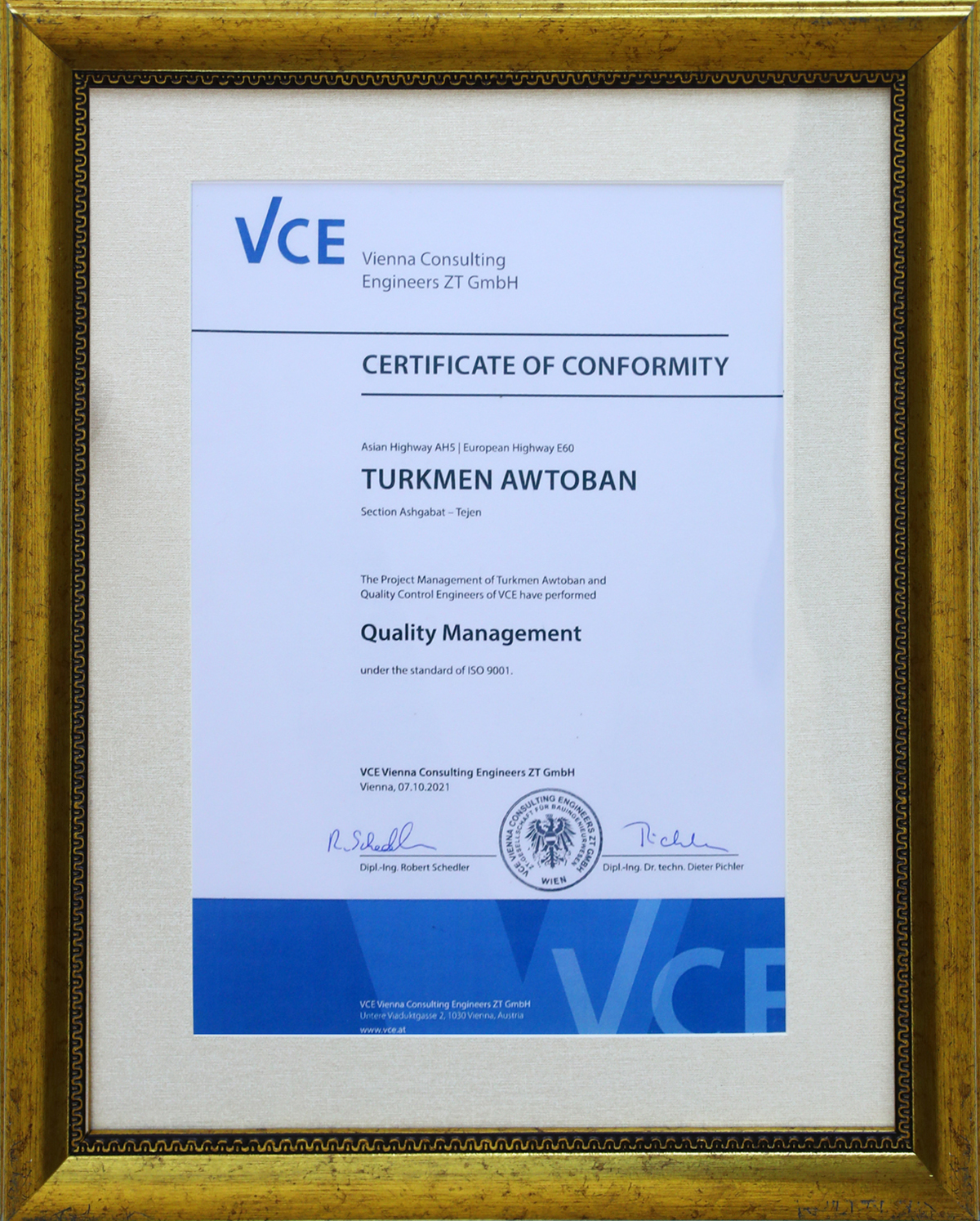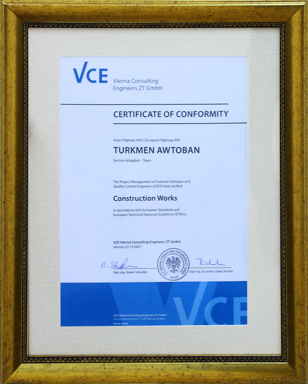 Awstriýanyň kompaniýasynyň wekili hormatly Prezidentimiz Gurbanguly Berdimuhamedowy we tutuş türkmen halkyny halkara derejeli Aşgabat — Türkmenabat ýokary tizlikli awtomobil ýolunyň birinji tapgyrynyň ulanylmaga berilmegi bilen tüýs ýürekden gutlap, täze düzümleýin desganyň degişli güwänamalara — awtomobil ýolunyň hiliniň ISO 9001 standartyna laýyklygy hem-de taslamany düzmek we gurluşyk boýunça işleriň halkara standartlaryna, hususan-da, “Ýol gurluşygyny taslamak” we “Gurluşyk işleri” standartlaryna laýyk gelýändigini tassyklaýan güwänamalara mynasyp bolandygyny habar berdi.