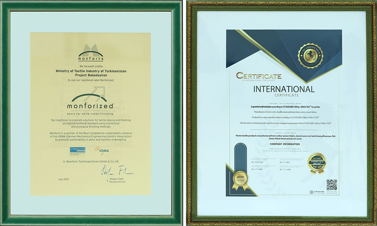 Babadaýhan dokma toplumy Germaniýanyň “Monforst” kompaniýasynyň güwänamasyna we guramalaryň hem-de kärhanalaryň hil menejment ulgamynyň ISO 9001 güwänamasyna, jemgyýet jogapkärçiligi menejment ulgamynyň SA 8000 güwanamasyna, şeýle hem Oeko-Teх Standard güwänamasyna mynasyp boldy. Munuň özi toplumyň önümleriniň ýokary ekologik talaplara we dünýä ölçeglerine laýyk gelýändigini aňladýar. Türkmenistanyň dokma senagaty köp ýyllaryň dowamynda önümleriniň ýokary hil derejesine mynasyp bolýandygy bilen giňden ykrar edilip, ISO 9001, ISO 14001 we OHSAS 18001 güwänamalaryna eýe boldy.