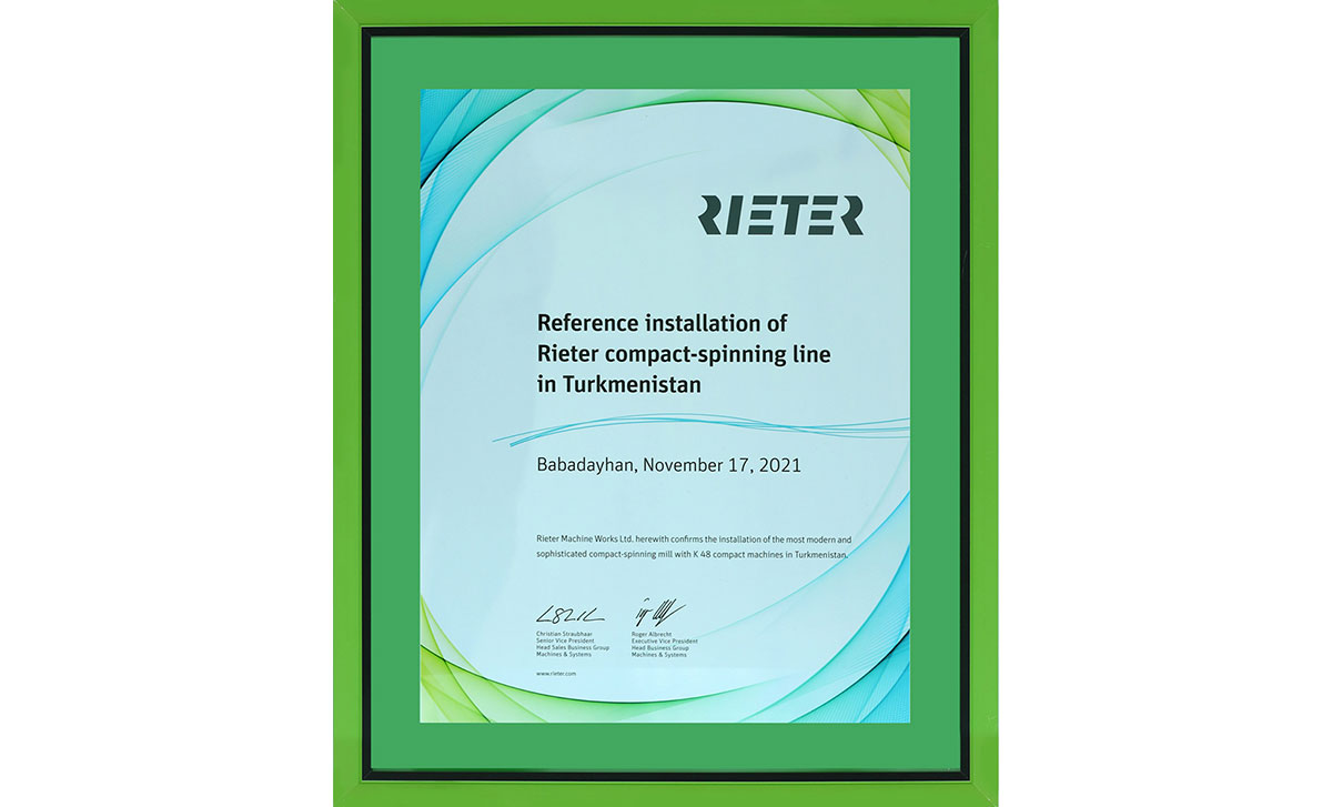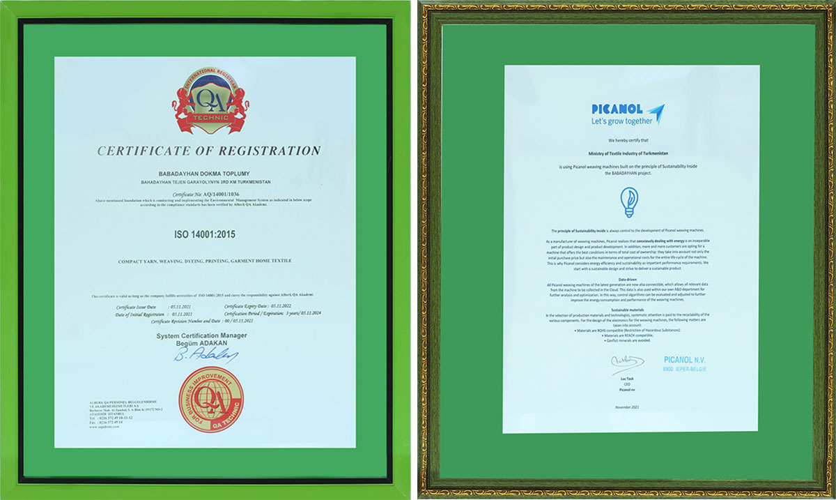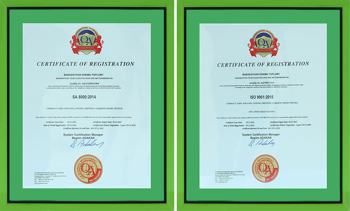 Durmuşa geçirilen ägirt uly işleriň netijesinde Türkmenistanyň dokma senagaty bütin dünýäde ykrar edilip, ýokary sylaglara hem-de güwänamalara eýe boldy. Şunuň bilen baglylykda, kompaniýanyň wekili Babadaýhan etrabyndaky dokma toplumyna ISO 9001, ISO 14001, SA 8000, ISO 45001 we ISO 10002 hil güwänamalaryny gowşurmagyň özi üçin uly hormatdygyny belledi.