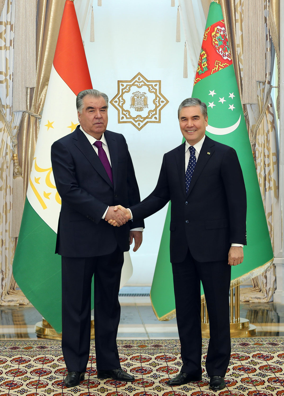 Iki ýurduň Prezidentleri Türkmenistanyň we Täjigistan Respublikasynyň Döwlet baýdaklarynyň öňünde surata düşdüler.