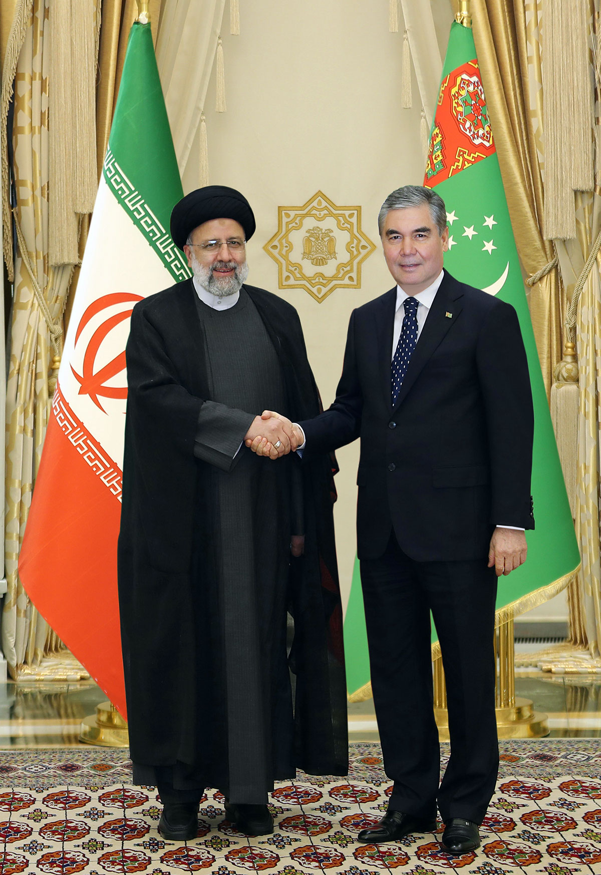 Iki ýurduň Prezidentleri Türkmenistanyň we Eýran Yslam Respublikasynyň Döwlet baýdaklarynyň öňünde surata düşdüler.