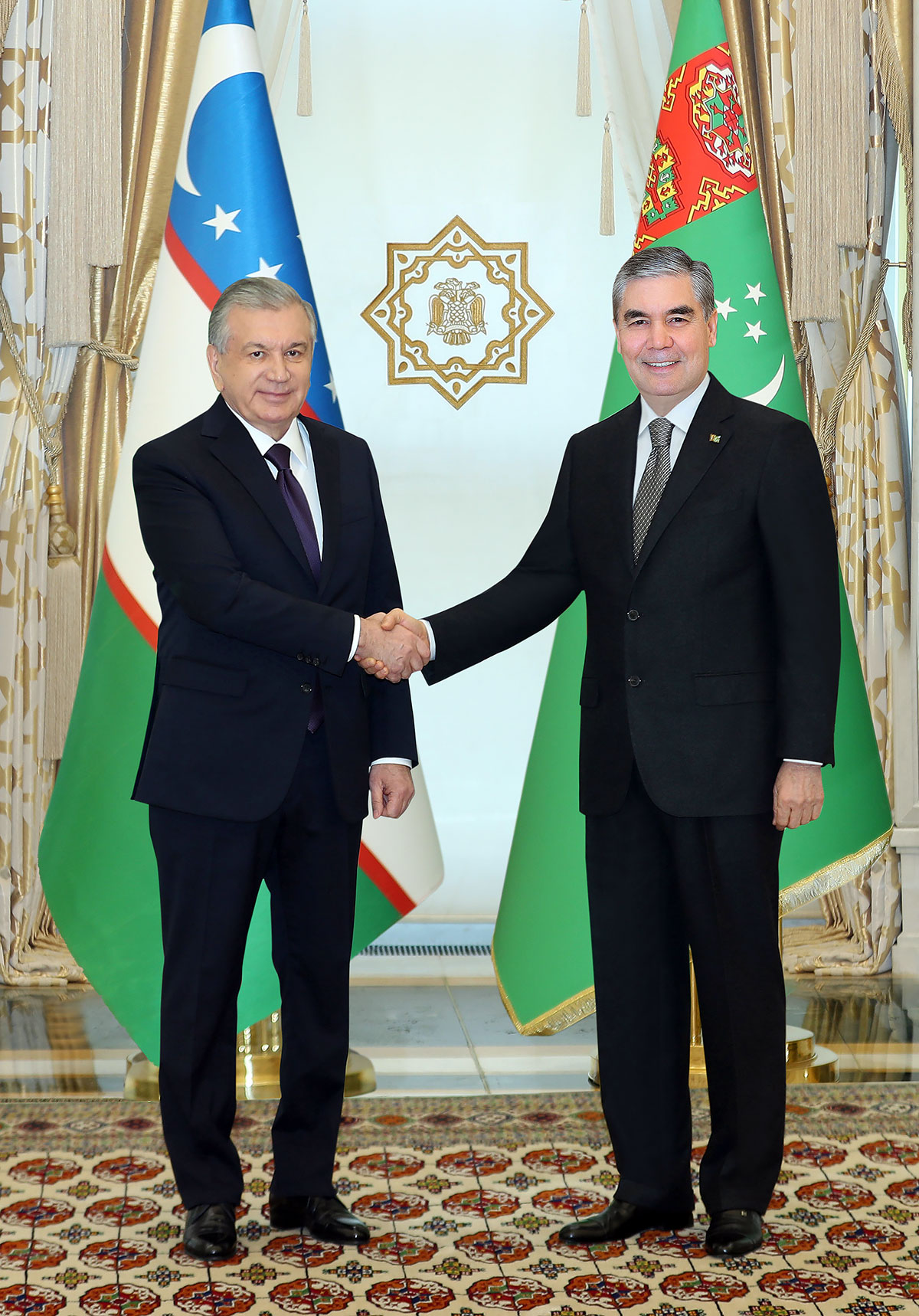 Iki ýurduň Liderleri Türkmenistanyň we Özbegistan Respublikasynyň Döwlet baýdaklarynyň öňünde surata düşdüler.