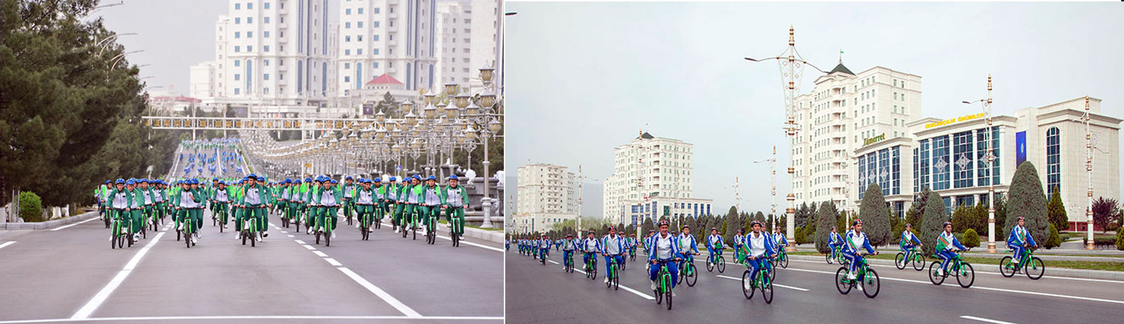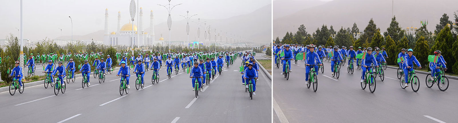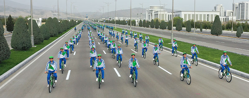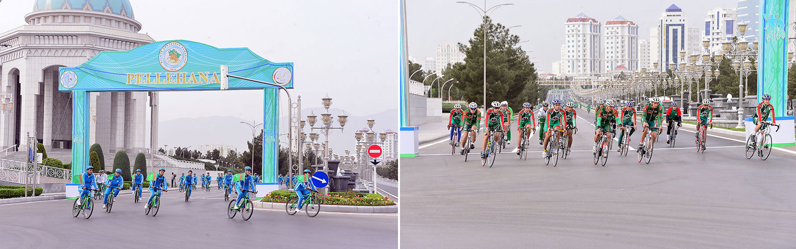Döwlet Baştutanymyz köpçülikleýin welosipedli ýörişe badalga berip, degişli sport lybasyna beslenen gatnaşyjylaryň kerweniniň öňüni çekdi. Hormatly Prezidentimiziň yzysüre hemmeler paýtagtymyzyň giň şaýollary bilen sazlaşykly herekete başladylar.
