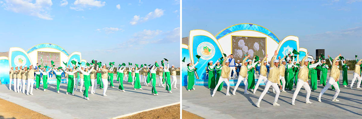Bu ýerde medeniýet we sungat ussatlarynyň aýdym-sazly çykyşlary ýaýbaňlandyryldy. Belent ruha beslenen aýdym-sazlarda ýurdumyzda hormatly Prezidentimiziň baştutanlygynda amala aşyrylýan beýik işleriň, gözel tebigatymyzyň we sahawatly topragymyzyň waspy ýetirildi. Sungat ussatlarynyň çykyşlary bu ýerde guralýan köpçülikleýin bag ekmek dabarasyna özboluşly baýramçylyk öwüşginini çaýdy.