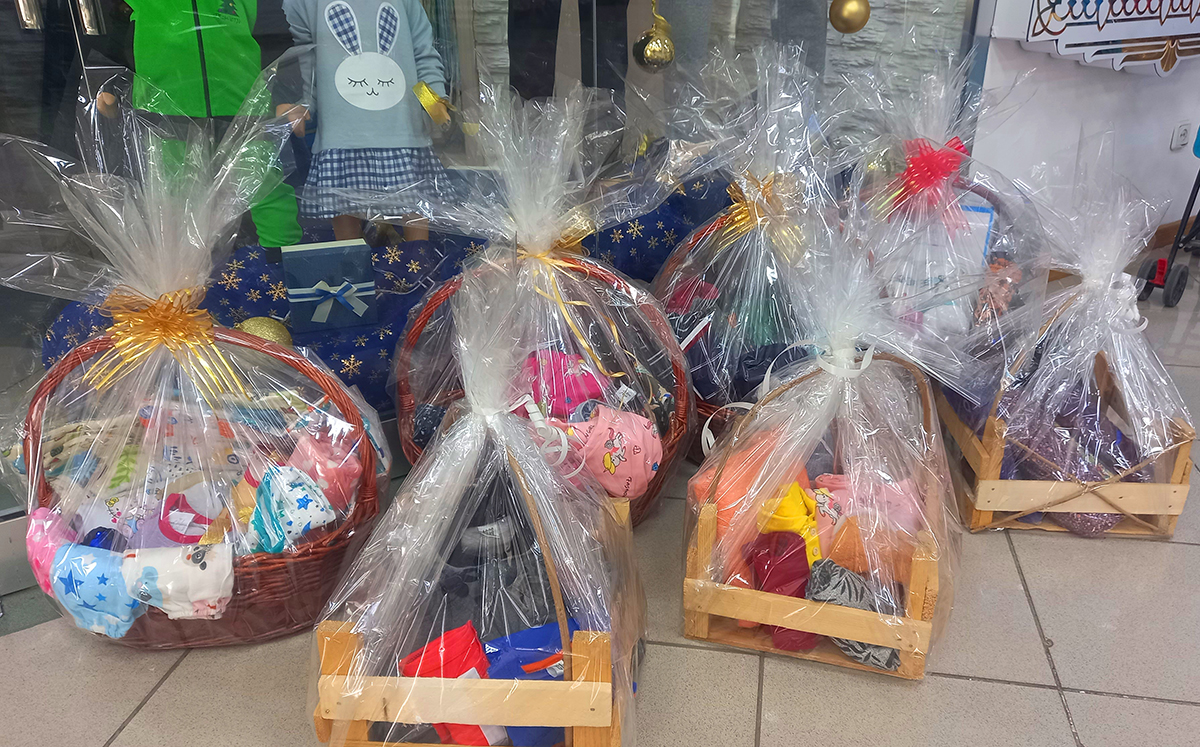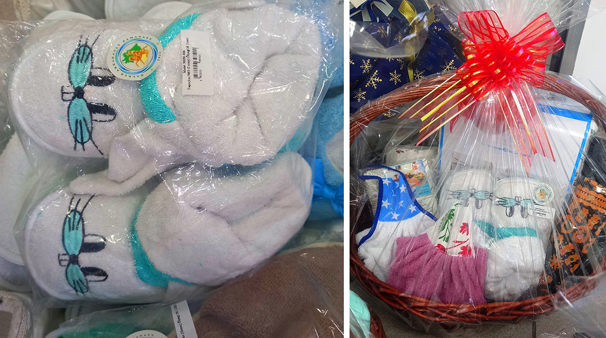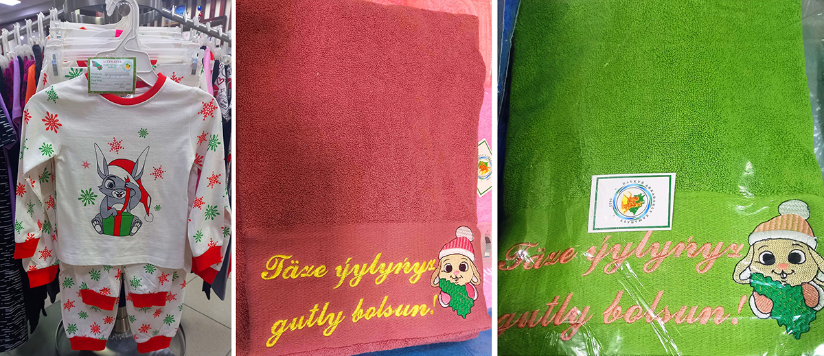Dükanyň dürli bölümlerinde ýokary hilli dokma önümleri bilen doldurylan sowgat sebetleri goýuldy. Bu baýramçylyk toplumlaryna ýetip gelýän ýylyň nyşany bilen bezelen owadan ýorgan-düşek daşlyklary, dürli matalar, şypbyklar we başga-da köp zat girýär.