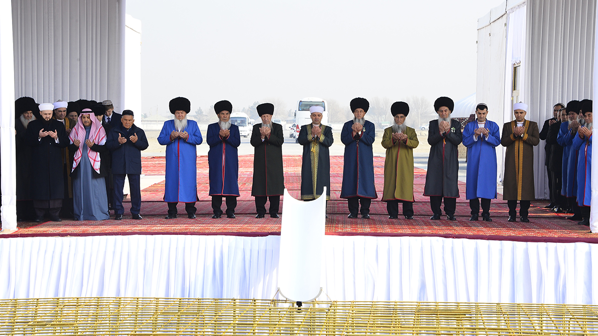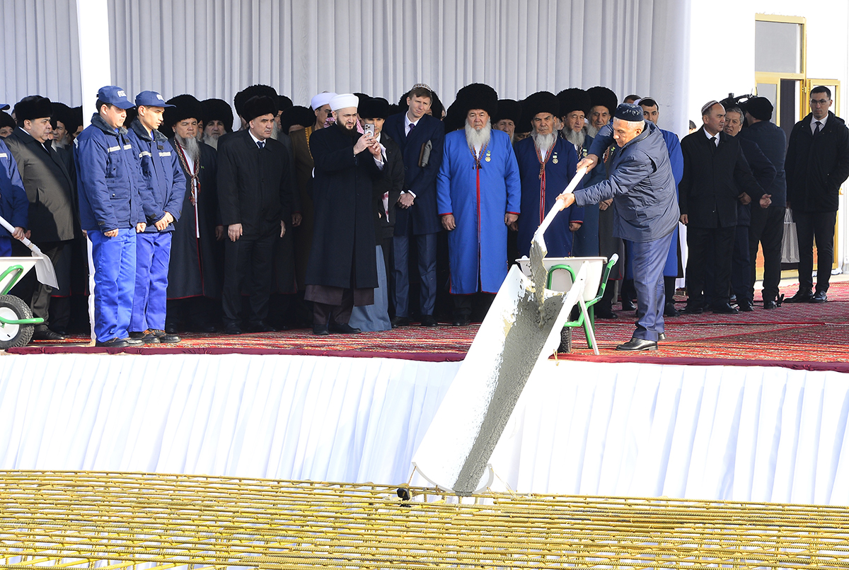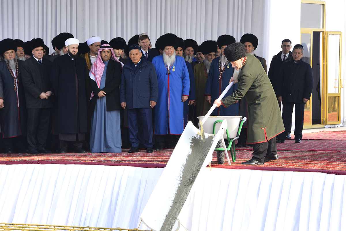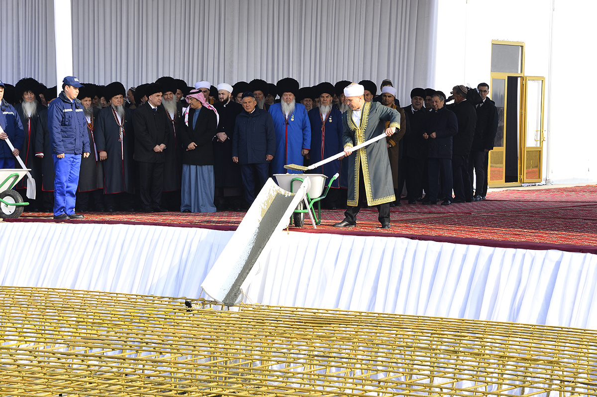 ...Türkmenistanyň müftüsi aýat-doga okap, Beýik Biribardan ýagşy dilegleri etdi. Bu doga-dileglere baş metjidiň düýbüni tutmak dabarasyna gatnaşyjylaryň ählisi goşuldylar. Soňra hemmeler agzybirlikde “Bismilla!” diýip, pil bilen beton garyndysyny atdylar.