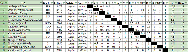 Şowsuz başlangyja – birinji tapgyrda Şahruh Turaýewden utulandygyna garamazdan, 2472 FIDE reýtingi bolan Maksat Atabaýew ýaryşyň galan bölegini durnukly oýnap, netijede mümkin bolan 13 utukdan 10,5 utuk gazanmak bilen, ýeňiji boldy.