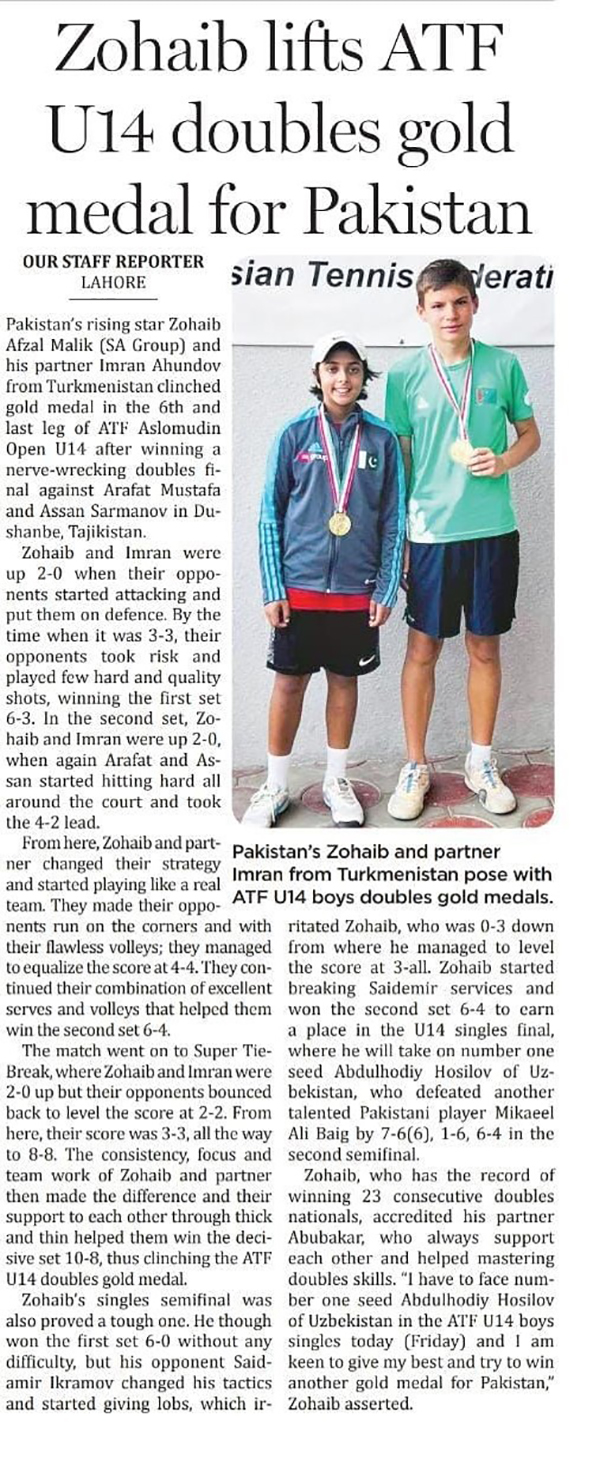 Türkmenistanly türgen Imran Ahundow 15-nji martdan bäri Duşanbe şäherinde ýaşy 14-e çenli oýunçylaryň arasynda geçirilen Aziýa tennis federasiýasynyň açyk dört ýaryşynyň soňky tapgyrynda altyn medala mynasyp boldy. Ildeşimiz pakistanly türgen Zohaib Afzal Malik bilen bilelikde çykyş edip, ýokary baýraga gazanmaga başardy.