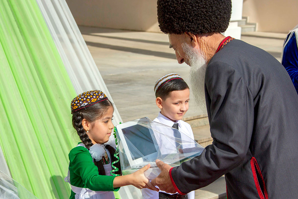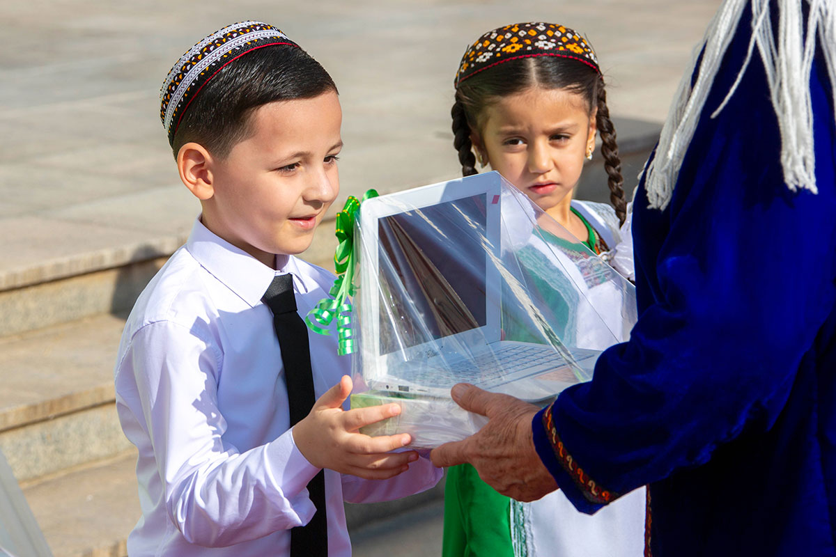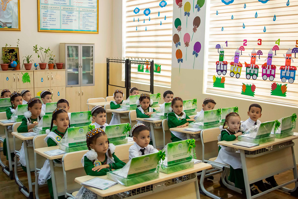 Birinji synp okuwçylaryna Gahryman Arkadagymyzyň we Türkmenistanyň Prezidenti Serdar Berdimuhamedowyň adyndan «Aýdyň Gijeler»HJ-niň hünärmenleriniň işläp taýýarlan kompýuterleri gowşuryldy.