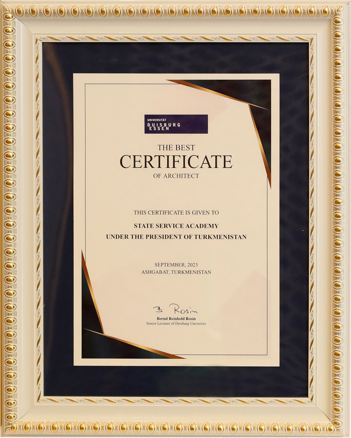 Germaniýa Federatiw Respublikasynyň “DUISBURG ESSEN” uniwersitetiniň “Iň gowy binagärlik” şahadatnamasyny akademiýanyň rektoryna şu uniwersitetiň uly mugallymy Bernd Reinhold Rosin dabaraly ýagdaýda gowşurdy.
