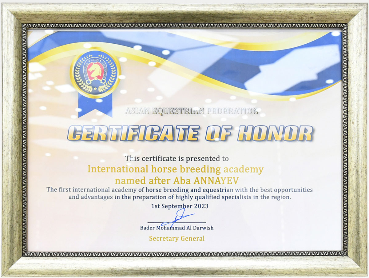 Aba Annaýew adyndaky Halkara atçylyk akademiýasy hem halkara şahadatnamalaryň birnäçesine mynasyp boldy.