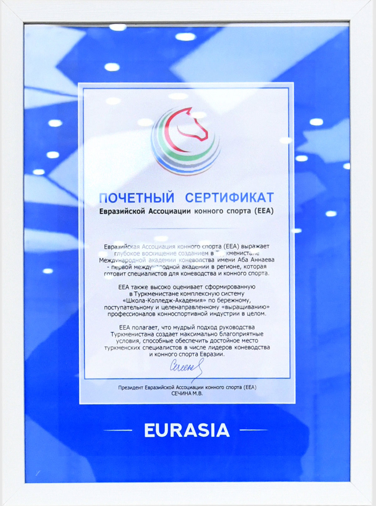 Ýygnananlaryň el çarpyşmalary astynda Ýewraziýa atly sport assosiasiýasynyň prezidenti Marina Seçina ýokary okuw mekdebiniň rektoryna sebitde atçylyk we atly sport boýunça ýokary hünärmenleri taýýarlaýan ilkinji halkara akademiýa bolan Aba Annaýew adyndaky Halkara atçylyk akademiýasynyň Türkmenistanda döredilendigi üçin Ýewraziýa atly sport assosiasiýasynyň Hormat şahadatnamasyny gowşurýar.
