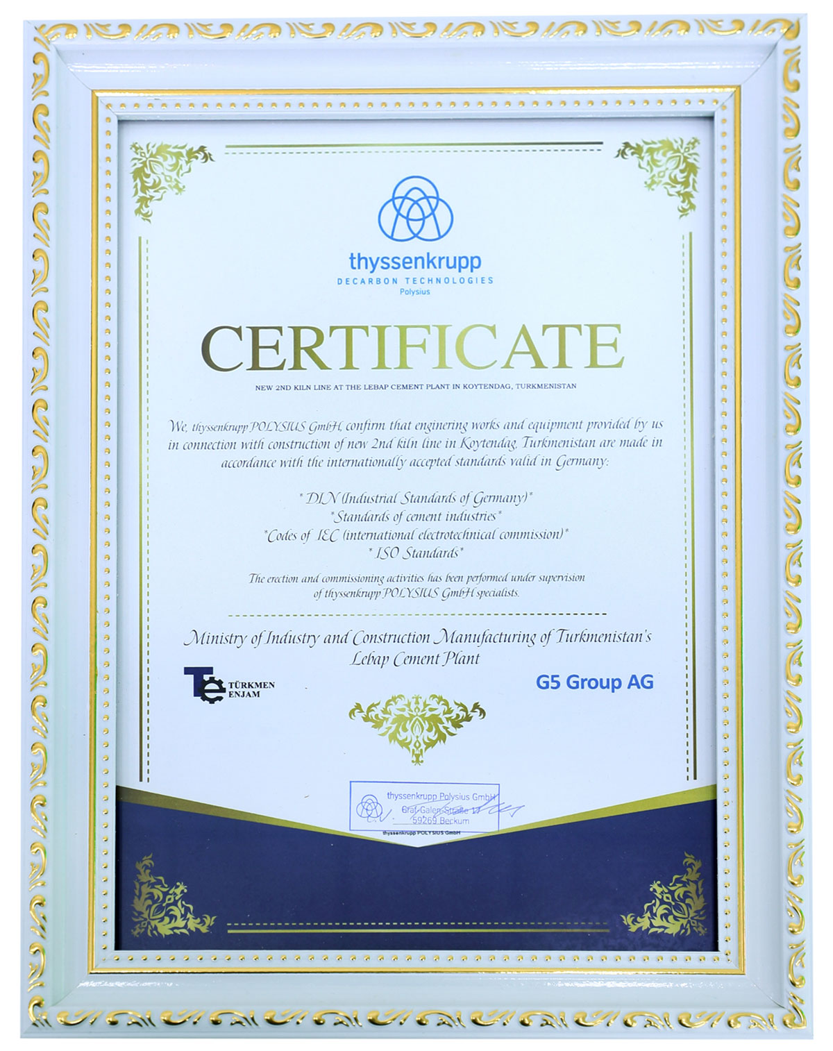 Lebap sement zawodynyň ikinji tapgyrynyň gurluşyk taslamasynyň çäklerinde “Thyssenkrupp” kompaniýasy tarapyndan getirilen enjamlar we ýerine ýetirilen inženerçilik işleri halkara ölçeglere, has takygy, Germaniýanyň senagat standartlaryna — DIN ülňülerine, sement senagatynyň standartlary hem IEC we ISO standartlaryna doly laýyk gelýär. Şunuň bilen baglylykda, «Thyssenkrupp Polysius GmbH» kompaniýasynyň wekili Türkmenistanyň senagat we gurluşyk önümçiligi ministrine degişli güwänamany gowşurdy.