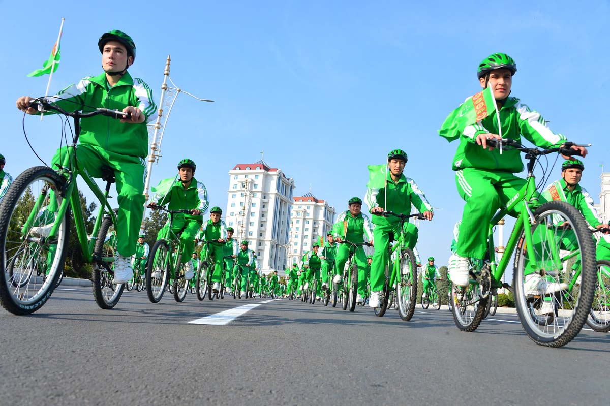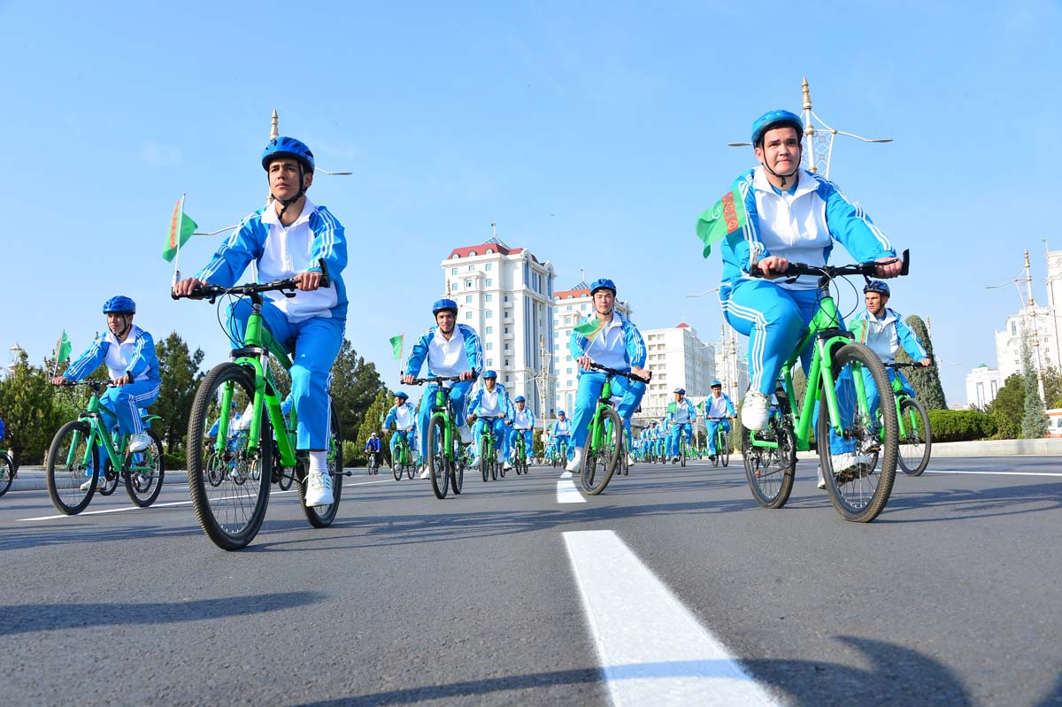...Döwlet Baştutanymyzyň başyny çekýän welosipedli ýörişe gatnaşyjylaryň kerweni öz ýoluny dowam etdirýär. Ýazyň ir säheriniň jana ýakymly arassa howasy, Köpetdagyň etegindäki tebigatyň ajaýyp ýerleri, Aşgabadyň haýran galdyrýan görnüşleri gözüňi dokundyryp, ruhuňy göterýär. Köpçülikleýin welosipedli ýörişiň geçýän ugrunda ýaýbaňlandyrylan döredijilik toparlarynyň we türgenleriň görkezme çykyşlary baýramçylygyň şowhunyny has-da artdyrýar.