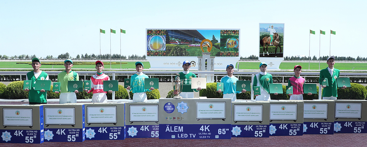 Soňra baýramçylyk at çapyşyklarynyň, şeýle hem şu hepdede geçirilen uzak aralyga atly ýöriş bäsleşiginiň, bedewleriň päsgelçiliklerden böküp geçmek boýunça bäsleşiginiň ýeňijilerine hormatly Prezidentimiz Serdar Berdimuhamedowyň adyndan gymmat bahaly sowgatlary gowşurmak dabarasy boldy.