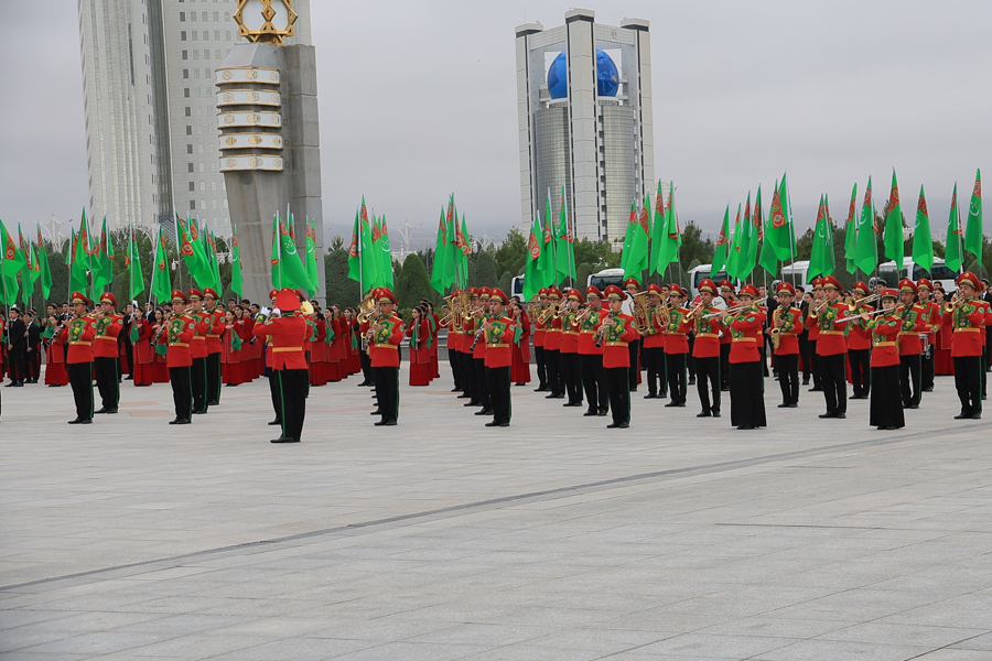 Hormatly Prezidentimiz Serdar Berdimuhamedowyň awtoulagy Baş baýdak meýdançasyna gelýär. Bu ýere ýygnananlar döwlet Baştutanymyzy mähirli mübärekleýärler. Türkmenistanyň Döwlet senasy ýaňlanýar.