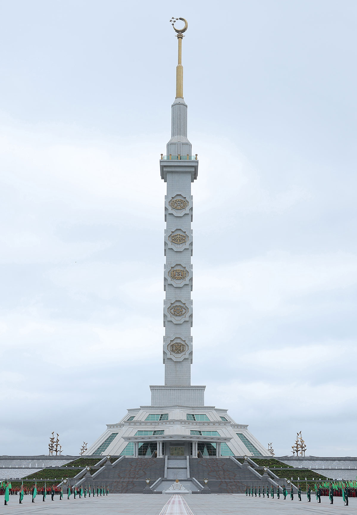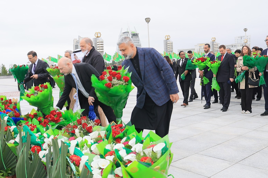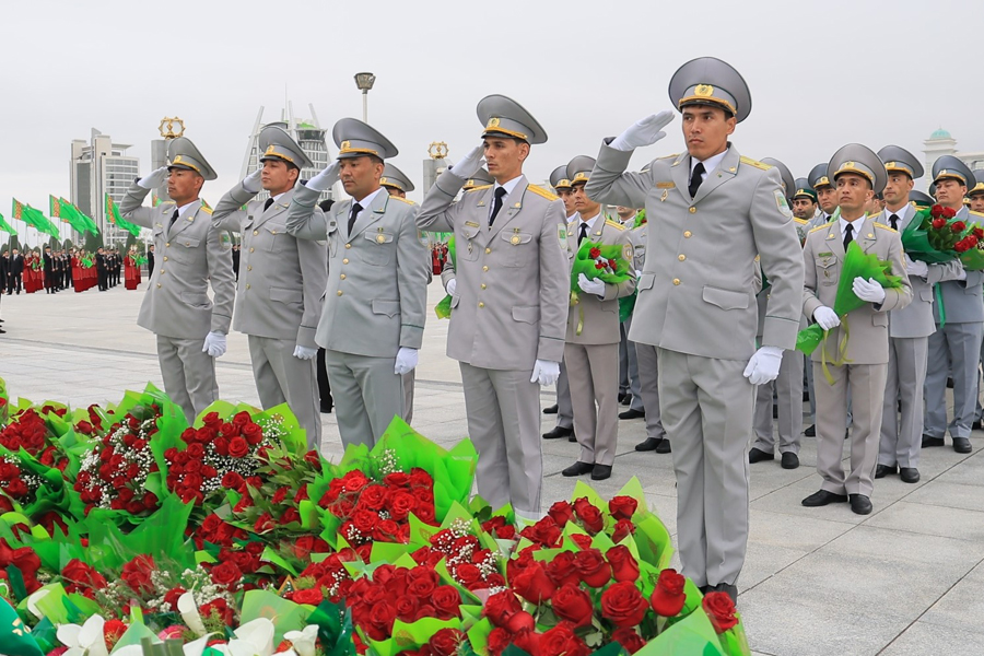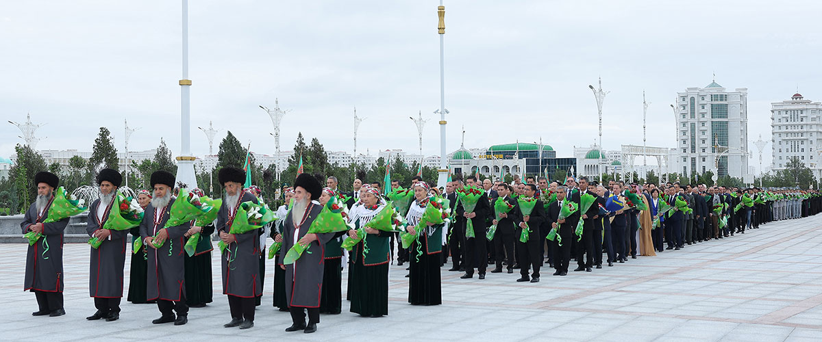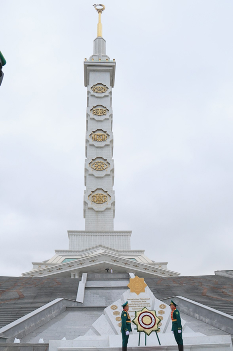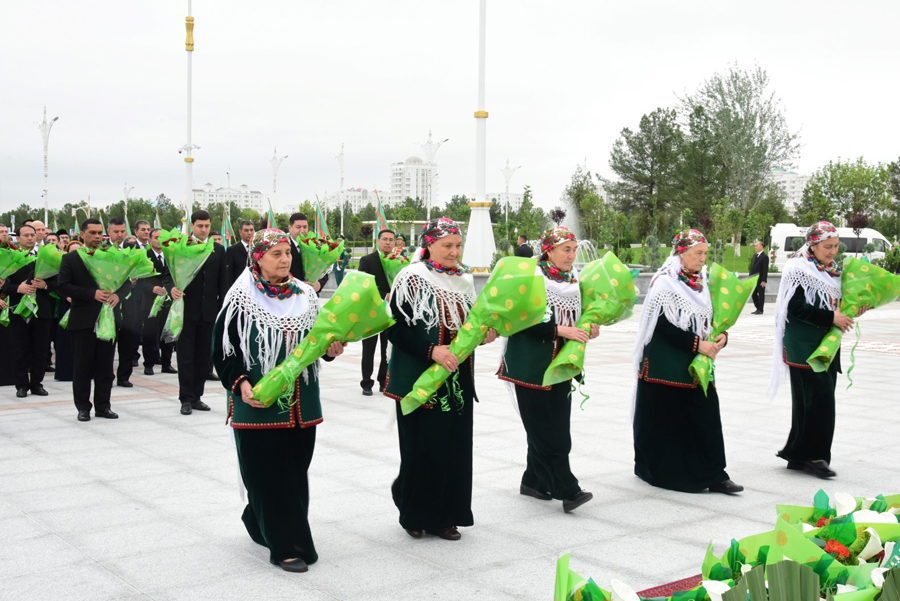 Hormatly Prezidentimiziň göreldesine eýerip, Ministrler Kabinetiniň Başlygynyň orunbasarlary, Mejlisiň, ministrlikleriň, pudaklaýyn dolandyryş edaralarynyň, harby we hukuk goraýjy edaralaryň ýolbaşçylary, hormatly ýaşulular, jemgyýetçilik guramalarynyň wekilleri, dabara gatnaşyjylaryň ählisi gül desselerini we çemenlerini goýýarlar.