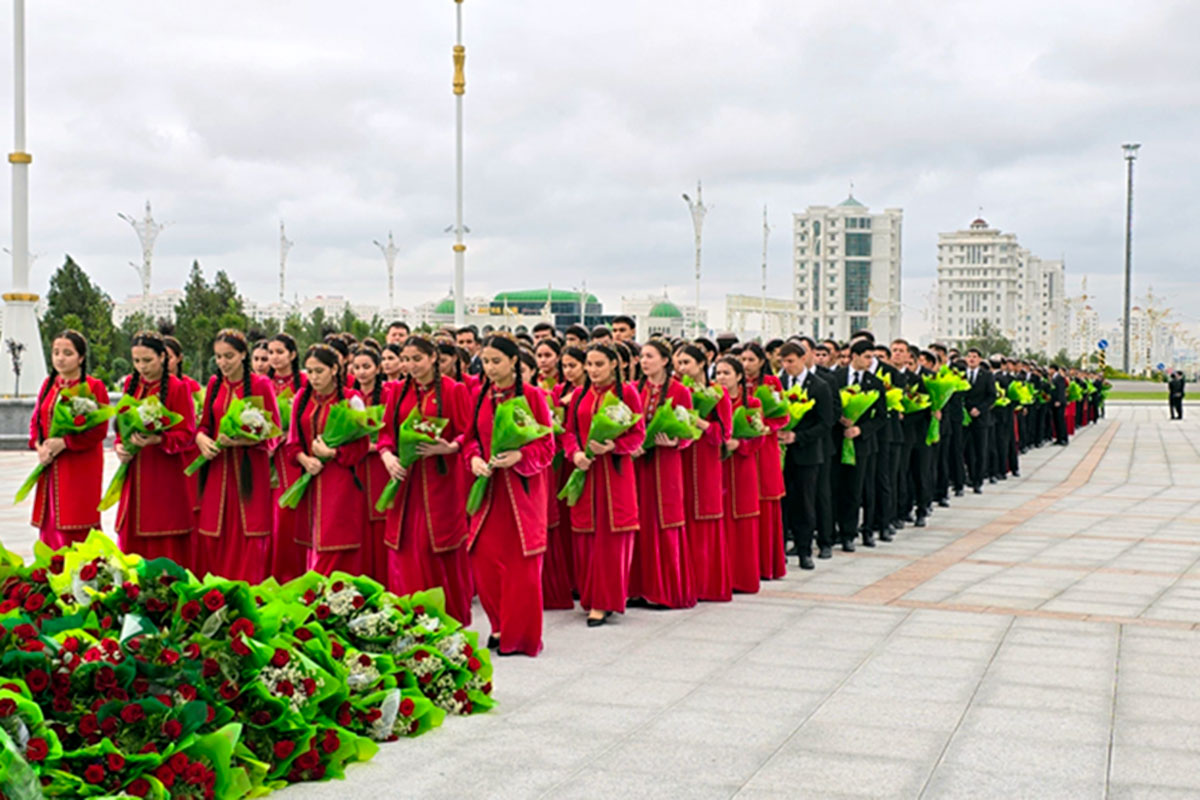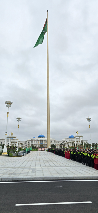 Hormatly Prezidentimiz Serdar Berdimuhamedow haly düşelen ýoda boýunça ýörite ýere geçýär. Ýodanyň iki tarapynda Watanymyzyň geljegi we daýanjy bolan talyp ýaşlar hatara durlar. Ýaş nesliň wekilleriniň ellerinde ýurdumyzyň Döwlet baýdagy buýsançly parlaýar. Türkmenistanyň Döwlet senasy ýaňlanýar.