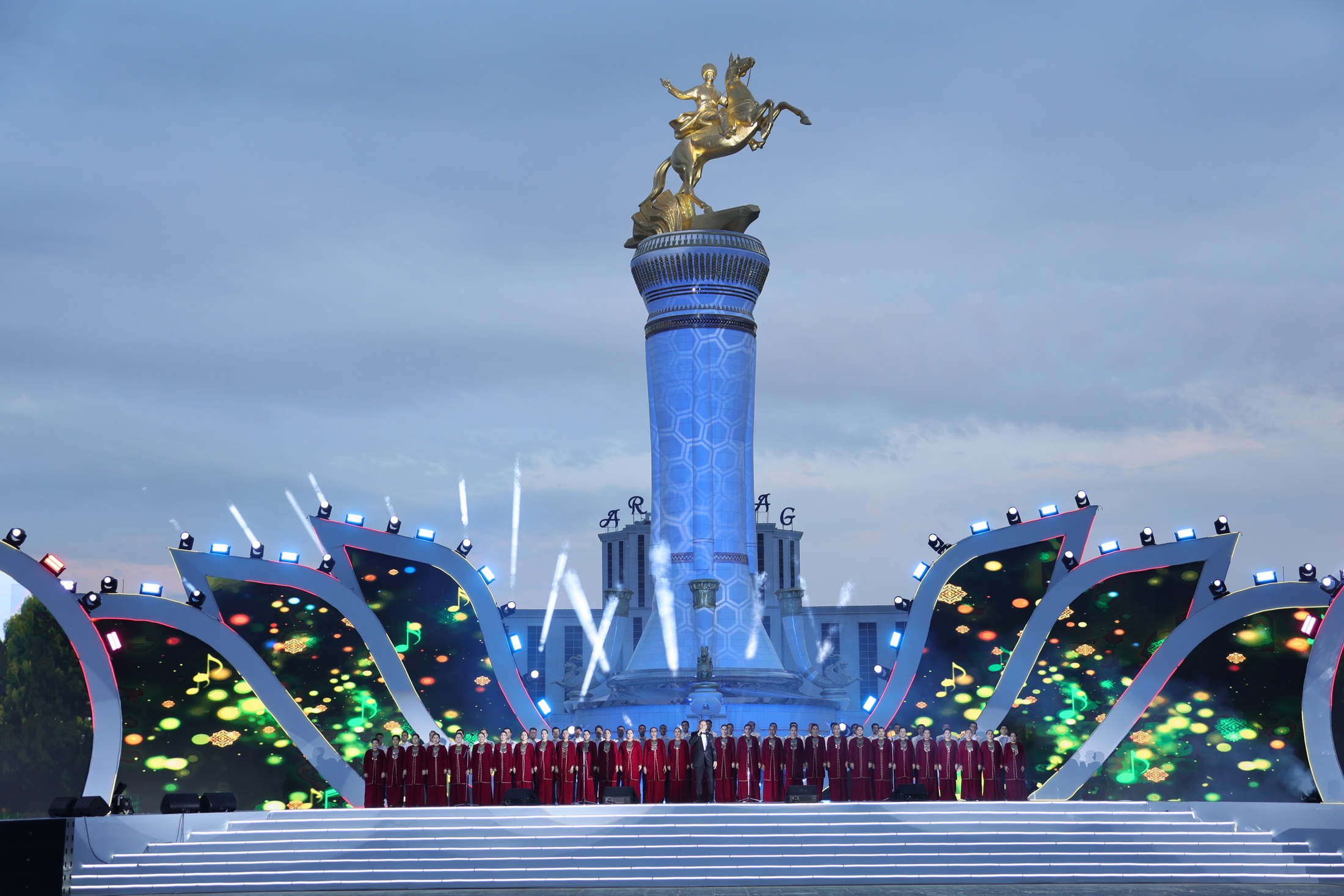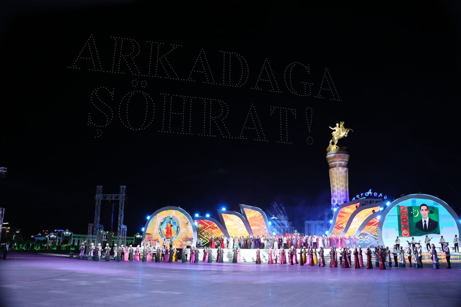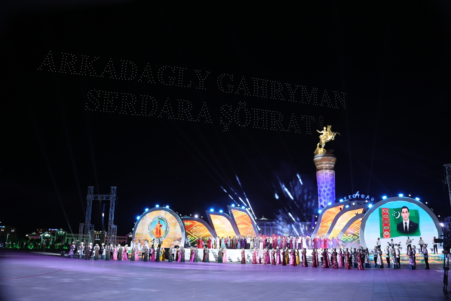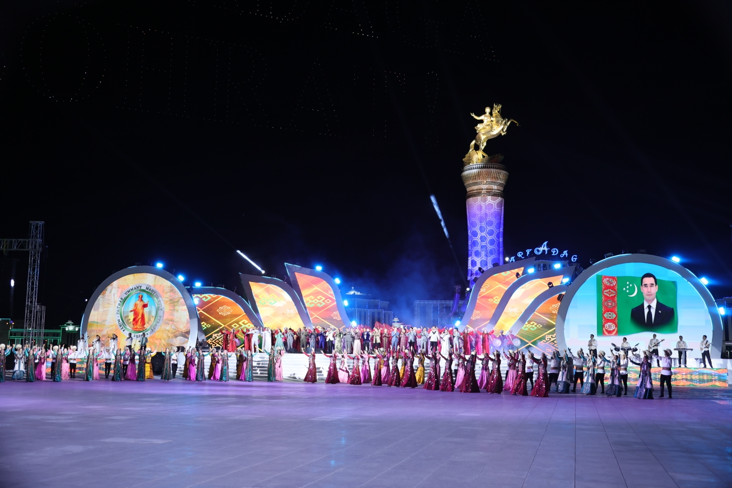 ...Agşam «Arkadag Binasynyň» öňündäki baýramçylyk meýdançasynda ýurdumyzyň we daşary ýurtlaryň sungat ussatlarynyň konserti boldy.