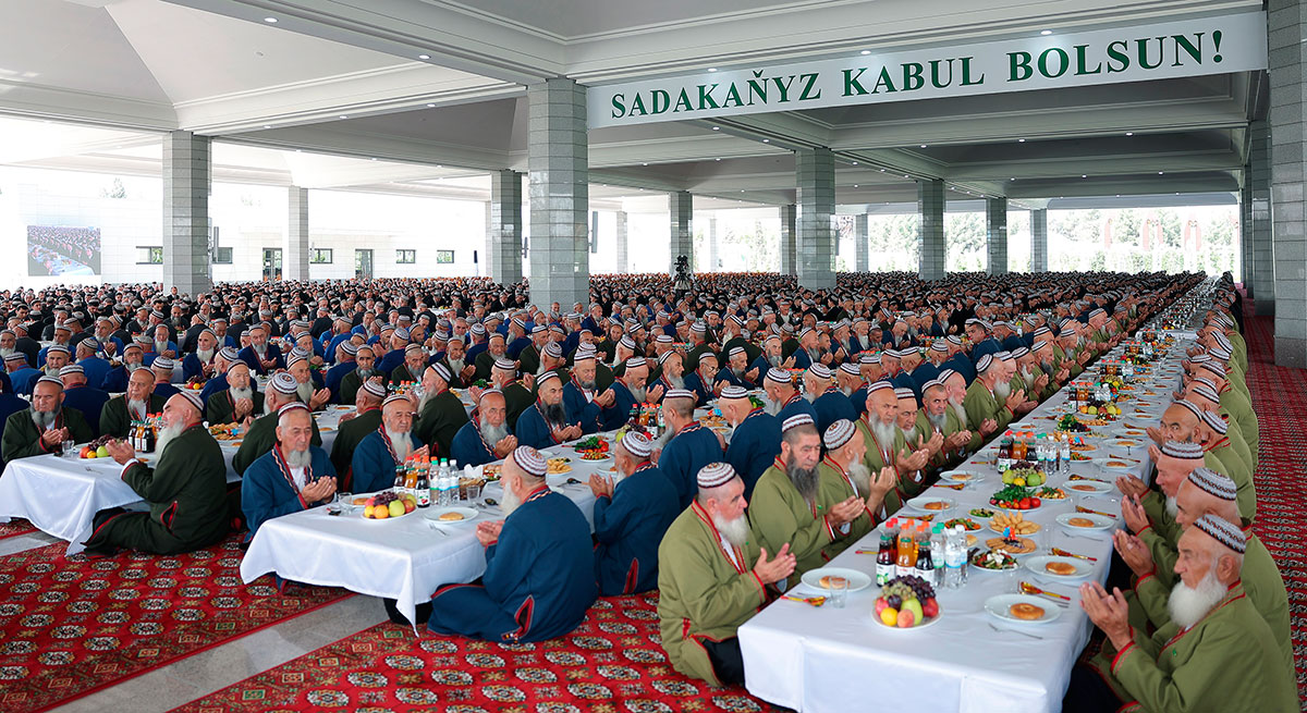 Türkmen halkynyň Milli Lideri sözüni dowam edip, bu gün öten-geçenlerimizi, Türkmenistanyň ilkinji Prezidenti merhum Beýik Saparmyrat Türkmenbaşyny ýatlap, sadaka berilýändigini belledi. Halkymyzyň mukaddes däp-dessuryny berjaý edip, «Ölüsini sylan beg bolar» diýlişi ýaly, biz şu gün türkmeniň gadymy däp-dessurlaryny berjaý edýäris. Bularyň hemmesi sogaply, parz işler. Arkadagly Gahryman Serdarymyzyň alyp barýan öňdengörüjilikli içeri we daşary syýasatynyň üstünliklere beslenmegini, halkymyzyň bagtyýar, abadan durmuşyna gönükdirilen taryhy işlerimiziň rowaç bolmagyny Beýik Biribardan dileg edýäris diýip, hajy Arkadagymyz nygtady.