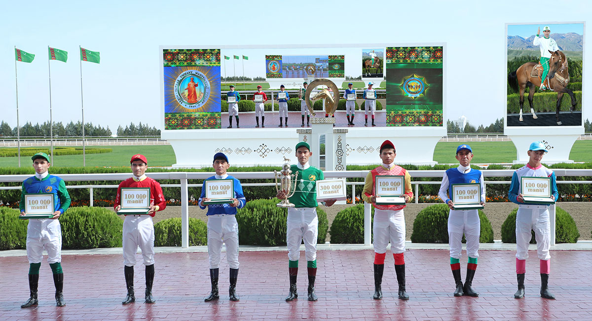 Soňra ýeňijileri sylaglamak dabarasy boldy. Bäsleşikde iň gowy netijeleri görkezenler döwlet Baştutanymyza we Gahryman Arkadagymyza ýurdumyzda atçylyk sportuny ösdürmek babatda hemmetaraplaýyn alada edýändigi üçin tüýs ýürekden hoşallyk bildirip, behişdi bedewleriň Ýer ýüzündäki şöhratyny artdyrmak ugrunda yhlasyny, başarnyklaryny gaýgyrmajakdyklaryna ynandyrdylar.
