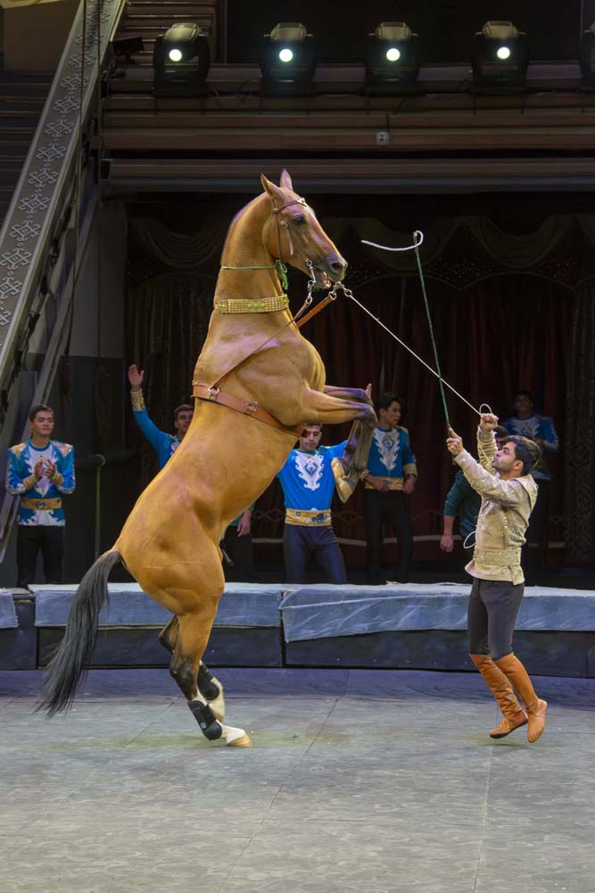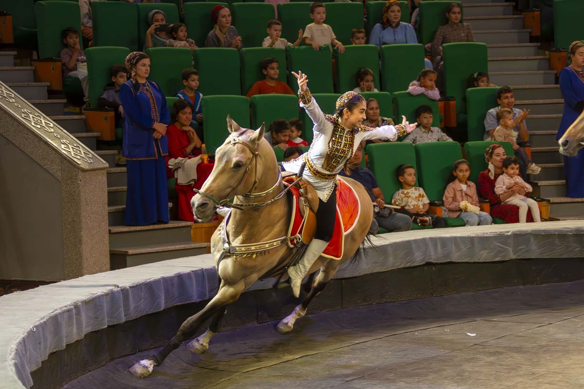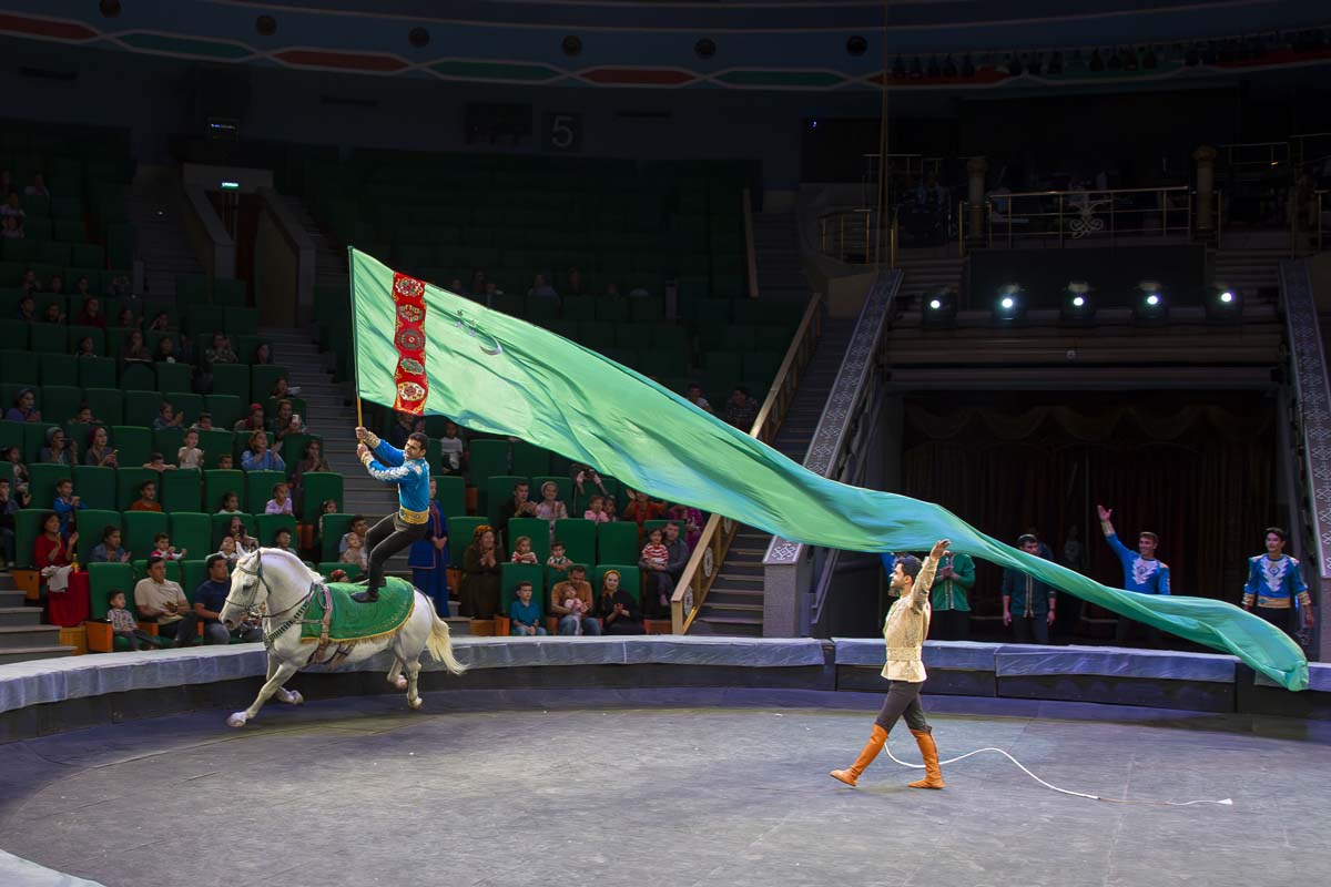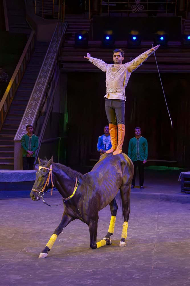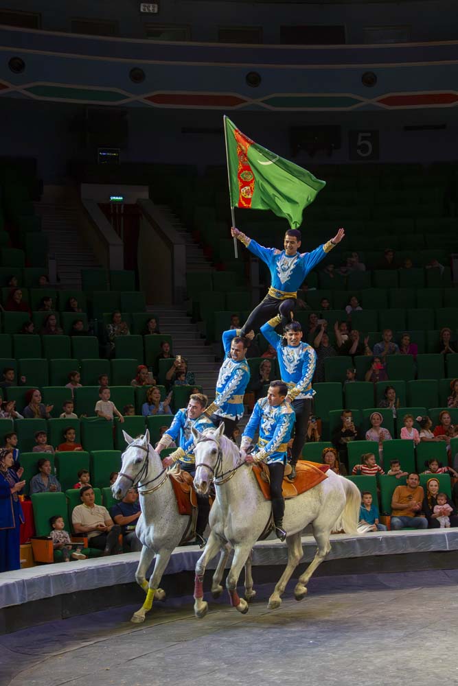 Sirk çykyşynyň ikinji bölüminde Serdar Baýramdurdyýewiň ýolbaşçylygyndaky «Galkynyş» at üstündäki milli oýunlar toparynyň ýigitleri çykyş etdiler. Owadan ahalteke bedewleri tomaşaçylara baş egip, nepis ýörüşleri we beýleki ajap oýunlary bilen özüne maýyl etdiler. Soňra ýigitleriň at üstündäki oýunlarynyň wagty geldi. Olar ýel kimin ýüwrük bedewlerde aşyr atyp, böküp münüp, bir-biriniň egnine münüp minara ýasap hem başga oýunlary görkezdiler. Olaryň edermenligi haýran galdyrýardy. Ýaşyl baýdak batyr çapyksuwarlaryň depesinde parlanda tomaşaçylaryň ýüreginde watanperwerlik duýgusy döredi.