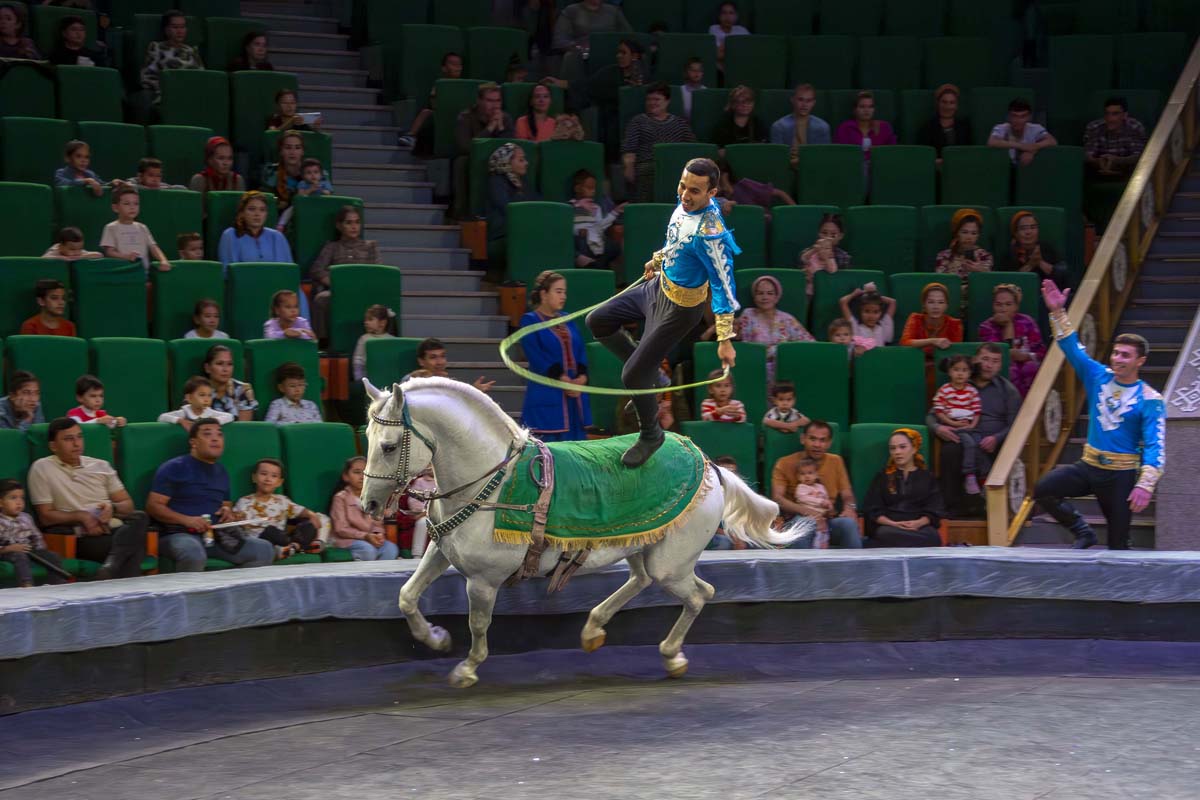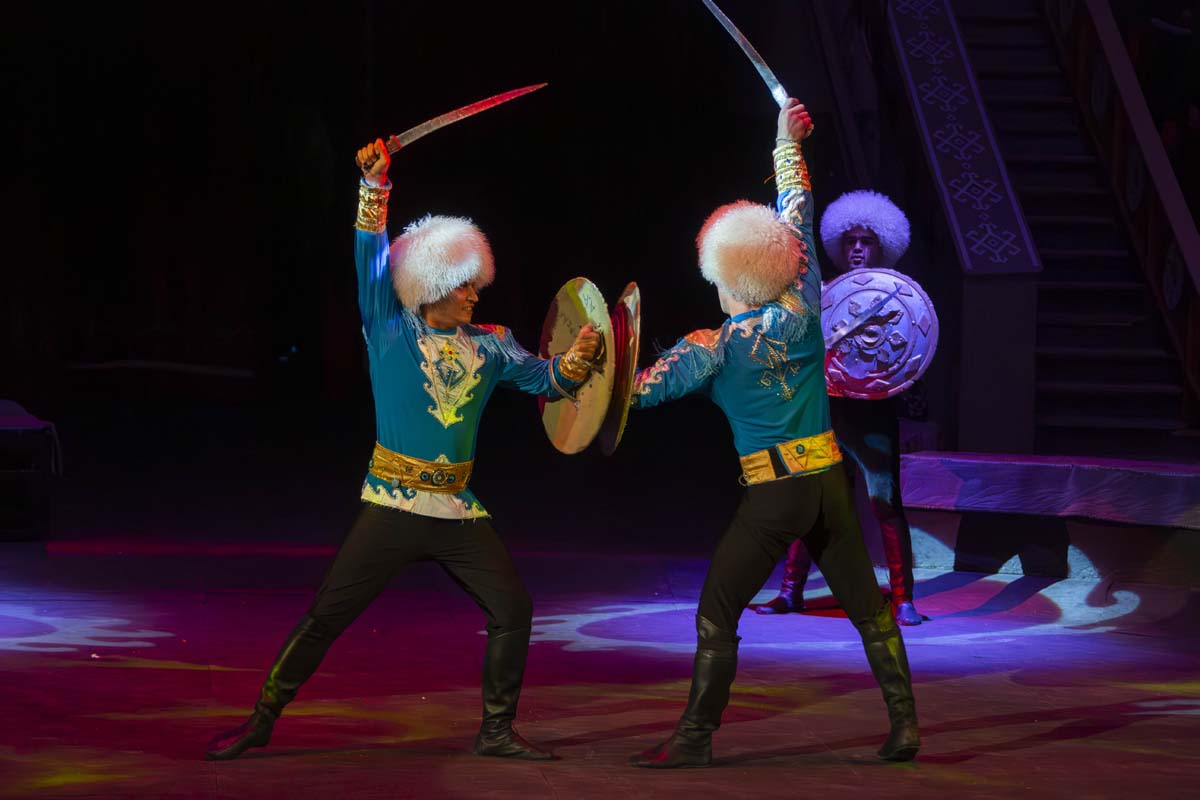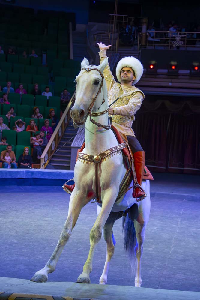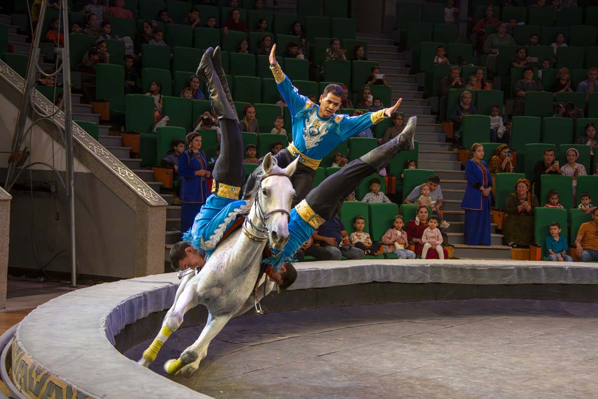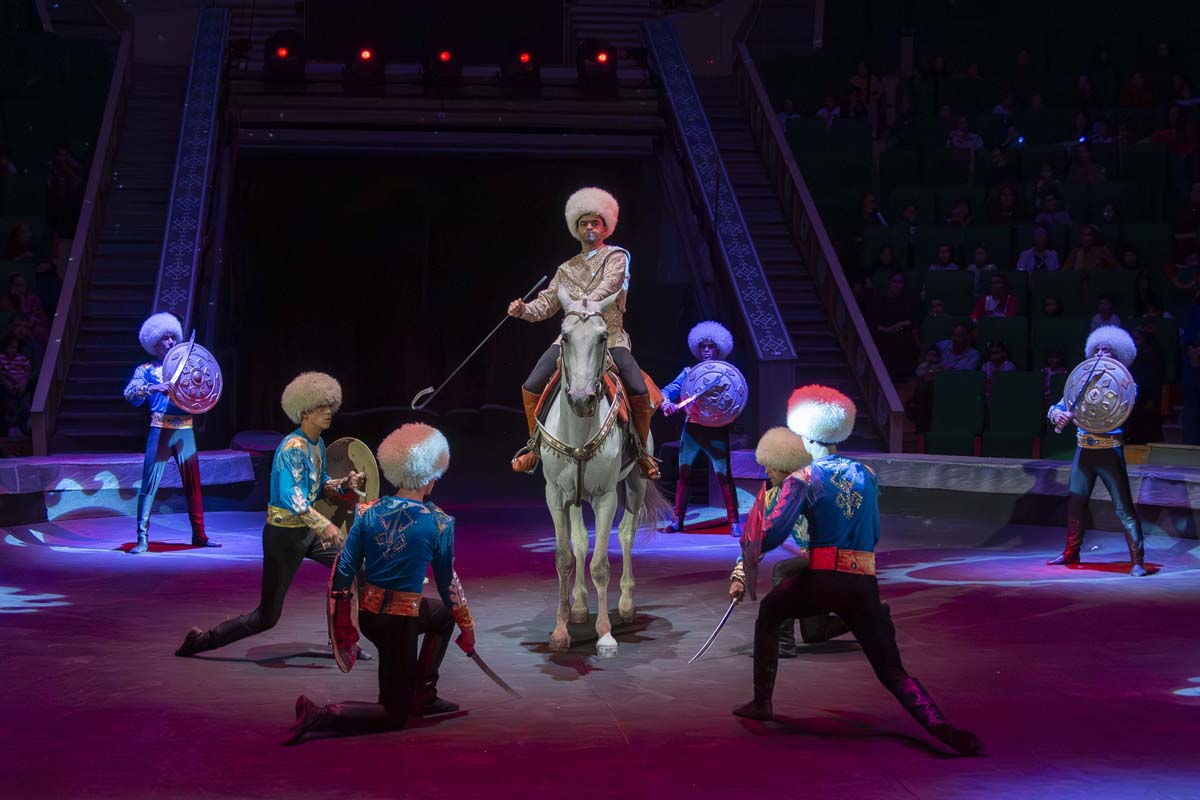 Sirk çykyşynyň ikinji bölüminde Serdar Baýramdurdyýewiň ýolbaşçylygyndaky «Galkynyş» at üstündäki milli oýunlar toparynyň ýigitleri çykyş etdiler. Owadan ahalteke bedewleri tomaşaçylara baş egip, nepis ýörüşleri we beýleki ajap oýunlary bilen özüne maýyl etdiler. Soňra ýigitleriň at üstündäki oýunlarynyň wagty geldi. Olar ýel kimin ýüwrük bedewlerde aşyr atyp, böküp münüp, bir-biriniň egnine münüp minara ýasap hem başga oýunlary görkezdiler. Olaryň edermenligi haýran galdyrýardy. Ýaşyl baýdak batyr çapyksuwarlaryň depesinde parlanda tomaşaçylaryň ýüreginde watanperwerlik duýgusy döredi.