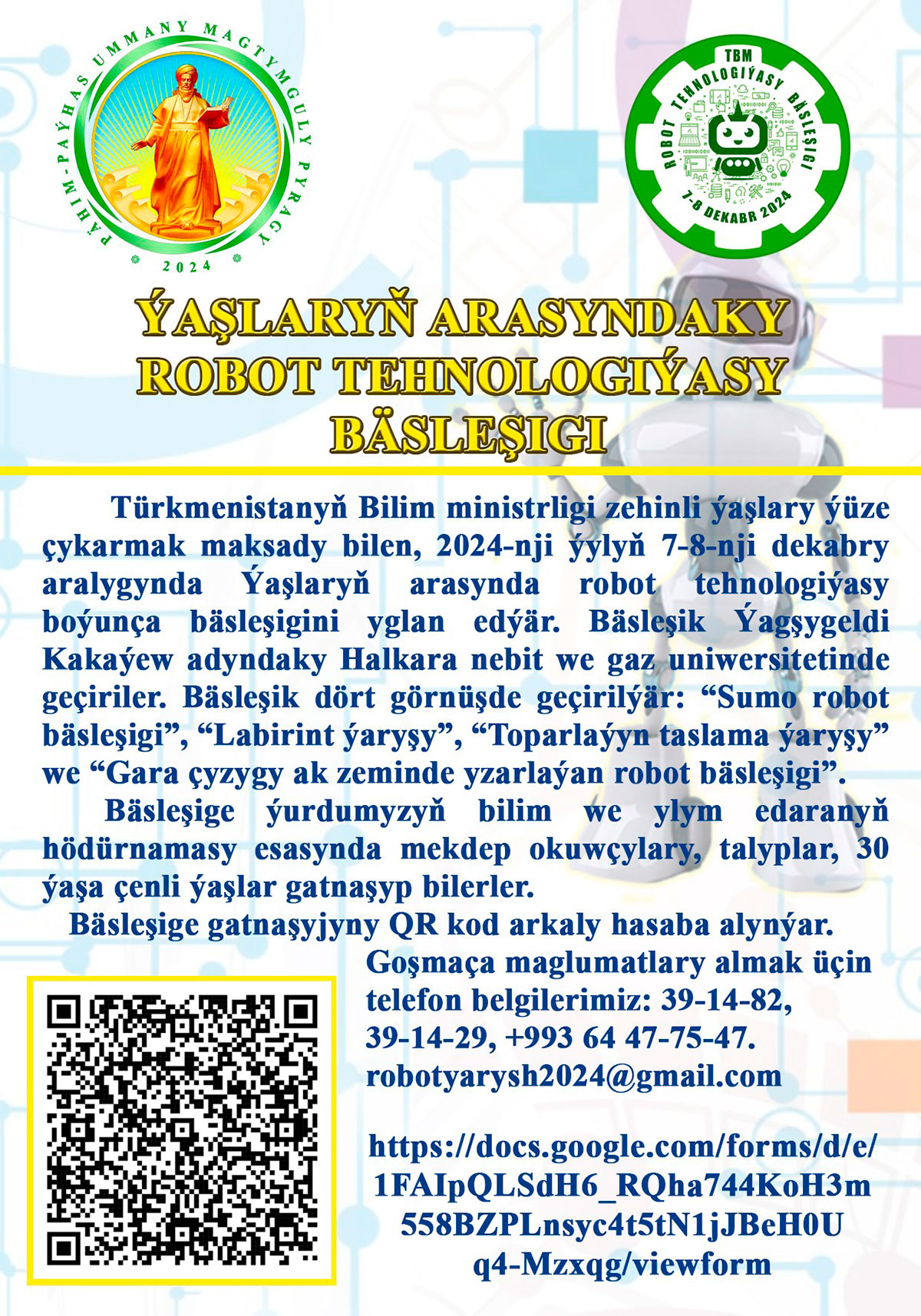 Zehinli ýaşlary ýüze çykarmak maksady bilen, Türkmenistanyň Bilim ministrligi robot tehnologiýalary boýunça ýaşlar bäsleşigine gatnaşjaklary hasaba almagyny dowam etdirýär. Bäsleşik 2024-nji ýylyň 7-8-nji dekabrynda Ýagşygeldi Kakaýew adyndaky Halkara nebit we gaz uniwersitetinde geçiriler.