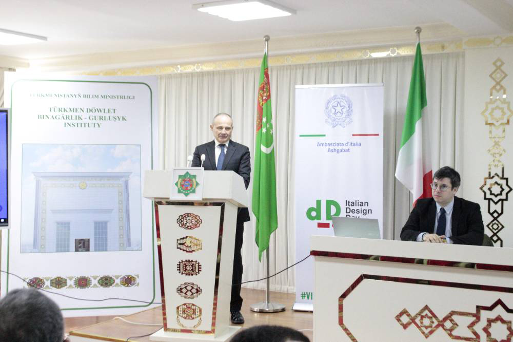 Italýan dizaýnynyň gününe bagyşlanyp geçirilen Aşgabatdaky çäreleriň Italiýanyň Modenese Gastone Interiors Srl interýer dizaýn kompaniýasynyň wekili Leandro Skalko Türkmen döwlet binagärlik-gurluşyk institutynyň talyplary üçin umumy sapak geçdi.